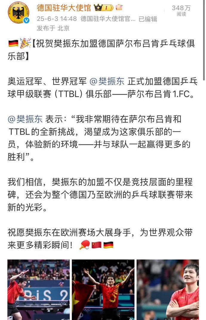从萨尔布吕肯的主场告别战,到赛后那句“我们永远是朋友和家人”的英文致谢,再到引发全场用中文高呼其名——樊振东在德甲的这一年,用顶尖的球技、绝对的职业精神和真诚的个人魅力,完成了一次极其成功的“民间外交”。