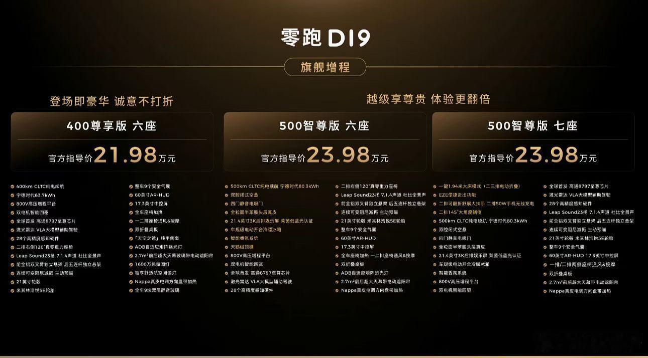 原来9系旗舰SUV价格也能这么香 零跑D19这次是真的把“旗舰平权”玩明白了,而且定价也无敌,21.98万起就能拿下一台5米2级别的全尺寸旗舰SUV,这种配置诚意,放在以前根本不敢想。