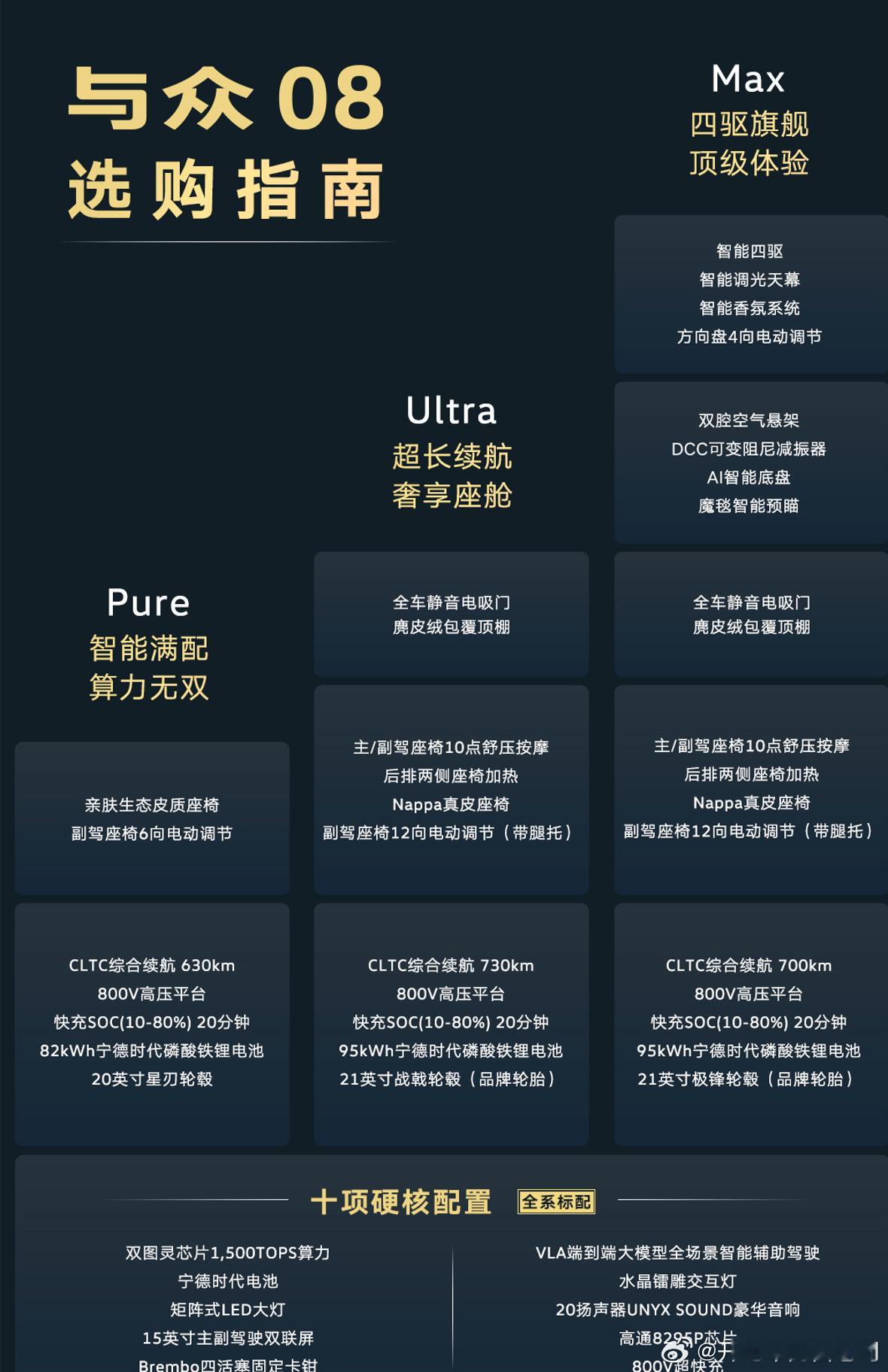 这是一台车长5米、轴距超3米的大众SUV,正宗的德味。跟新势力一样给到了全系800V超快充,5分钟补能150公里,最高730km续航。还有双腔空悬与魔毯底盘,车载冰箱、智能天幕等舒适性配置同样给到
