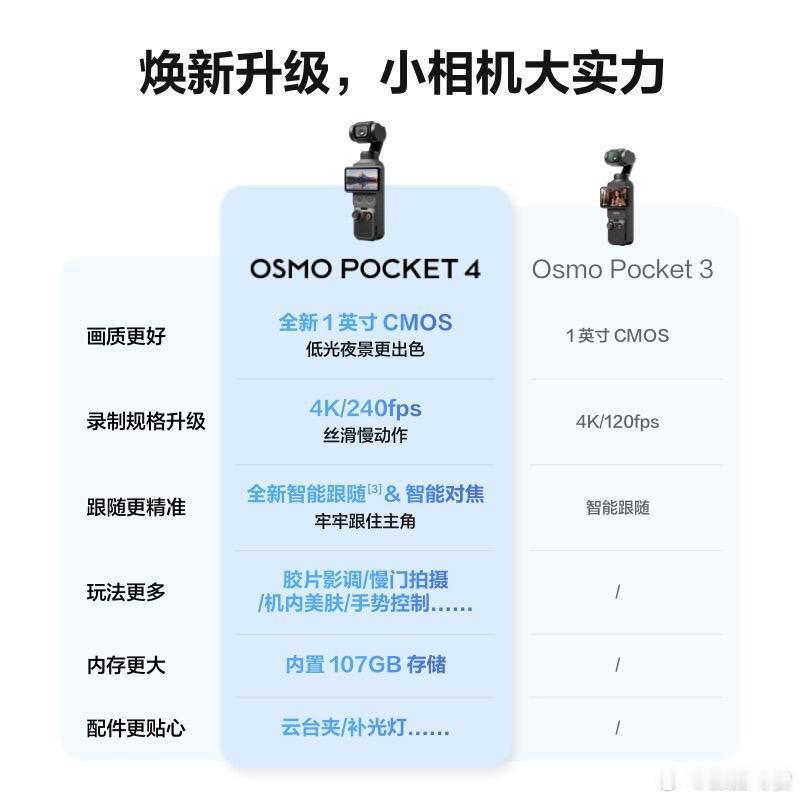 大疆Osmo Pocket 4对比Pocket 3,帧率升级至4K/240fps,新增智能对焦、胶片影调等功能,内置107GB存储,配件更丰富,手持拍摄综合实力全面提升。