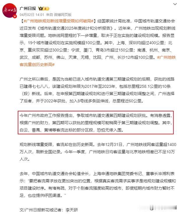 本月,广州当地广州日报表示第四轮地铁批复获批可能稍高于第三期规划调整。