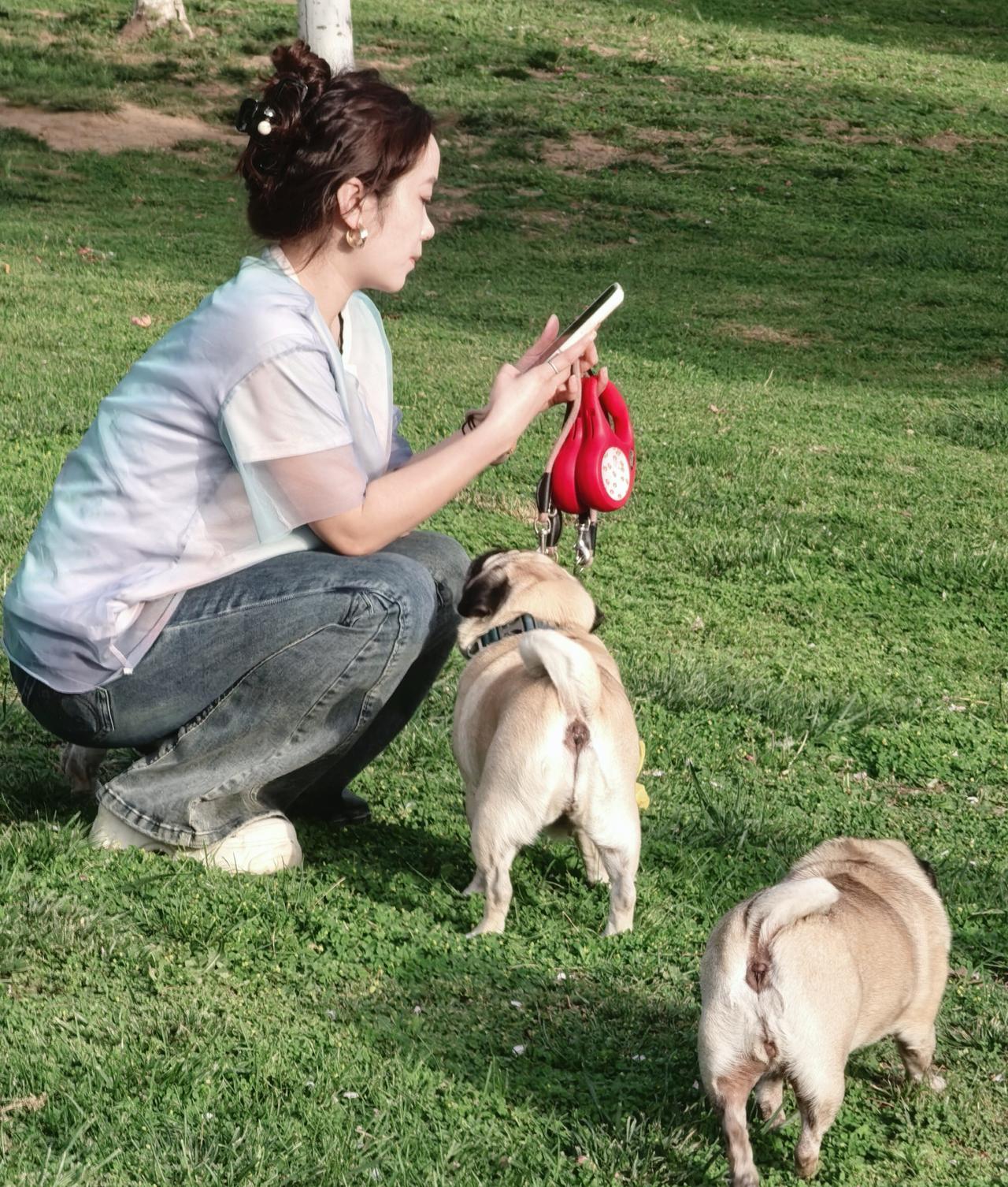 今天散步的时候,遇到三只巴哥犬。长的一模一样。挺萌,本想拍几张照片,巴哥犬好像挺害羞,躲在主人的身边。我只好随手拍了几张。