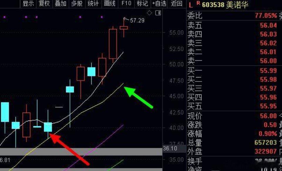 比如红色箭头尾盘唯一潜伏过的美诺华,2天2个涨停,只是第2个涨停早上直线反复2次封不住涨停,但是继续涨个不停,一周时间涨幅40%,那么中线这里的玩法是底仓后如果涨停启动的,那么没有利润垫底心态不好的,涨停后次日不能继续涨停的或是涨停附近不贪心走,比如美诺华第2个涨停附近不贪心走掉一半,这样子有20%个点利润垫底,然后另外一半不动,这样等于剩下半仓有40%个点利润垫底,那么后面这半仓不动就可以了,这样如果它后面涨的很高甚至更高,那么就能吃足后面的波段利润,然后有利润垫底后,后面的新目标自然有信心继续参与关注,大家学会了么?