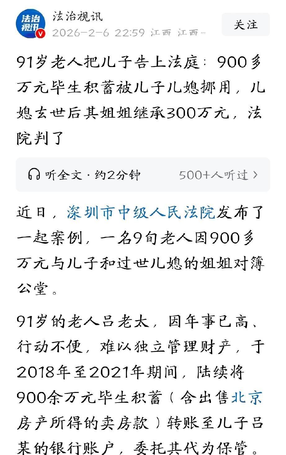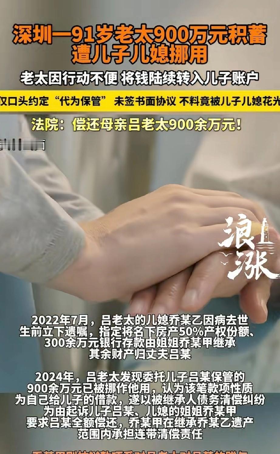 这就是养儿防老?广东深圳,一位91岁的老太太,年龄大了,怕自己哪天老糊涂,就把900多万元积蓄全部转给儿子,让儿子帮忙保管。本来以为儿子最靠谱,没想到儿子儿媳瞒着她,用这笔钱还了房贷、装修了房子。更气人的是,儿媳去世后,还立遗嘱把其中的300万给了姐姐。