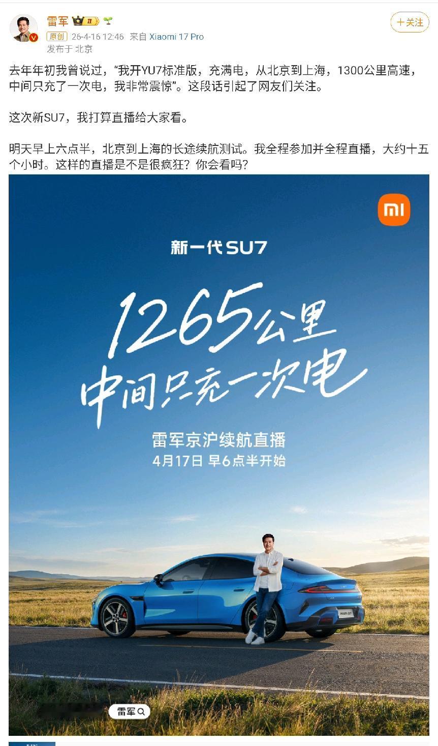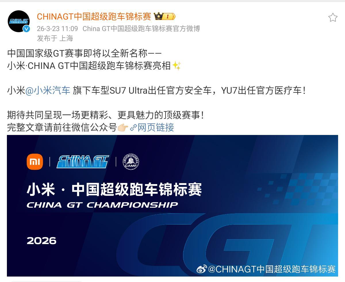 明天他将开新一代SU7京沪续航直播。2026赛季,小米冠名了中国超级跑车锦标赛CHINA GT。SU7 Ultra出任官方安全车,YU7出任官方医疗车。