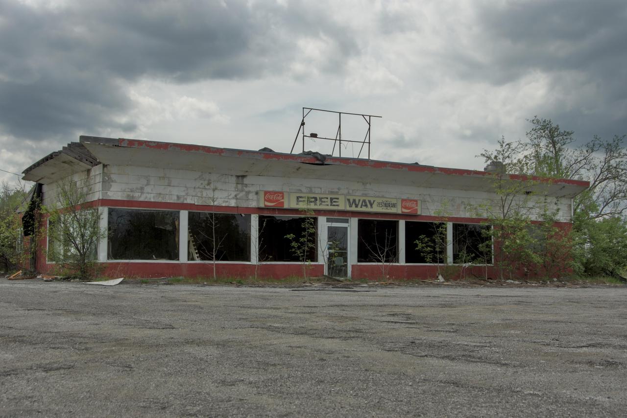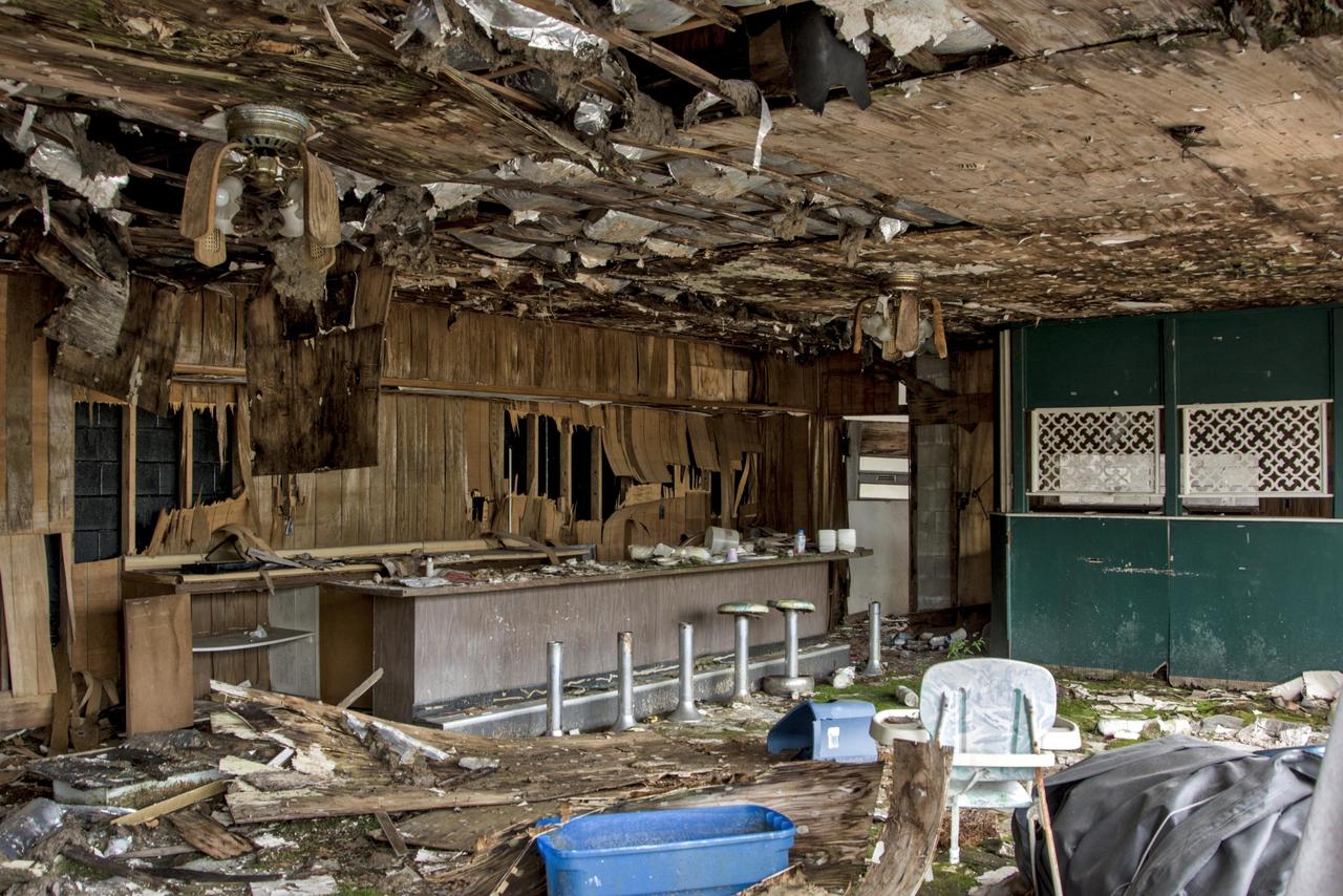 这是美国肯塔基州75号州际公路旁一家废弃餐厅的内部景象,桌椅散乱,墙壁剥落。风扇叶片因长期无人维护而下垂,显示建筑已荒废多年。这家餐厅曾为过往旅客提供餐饮服务,如今废弃可能影响当地商业和就业。