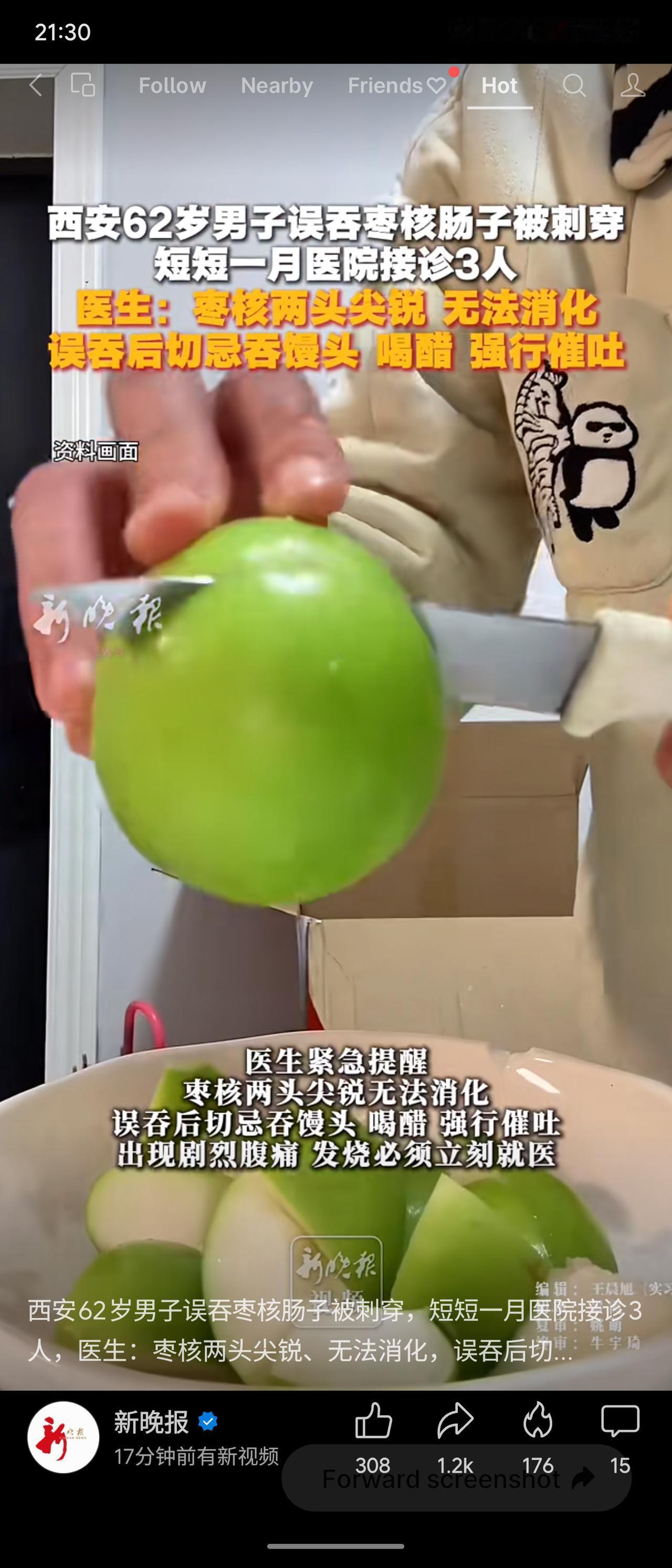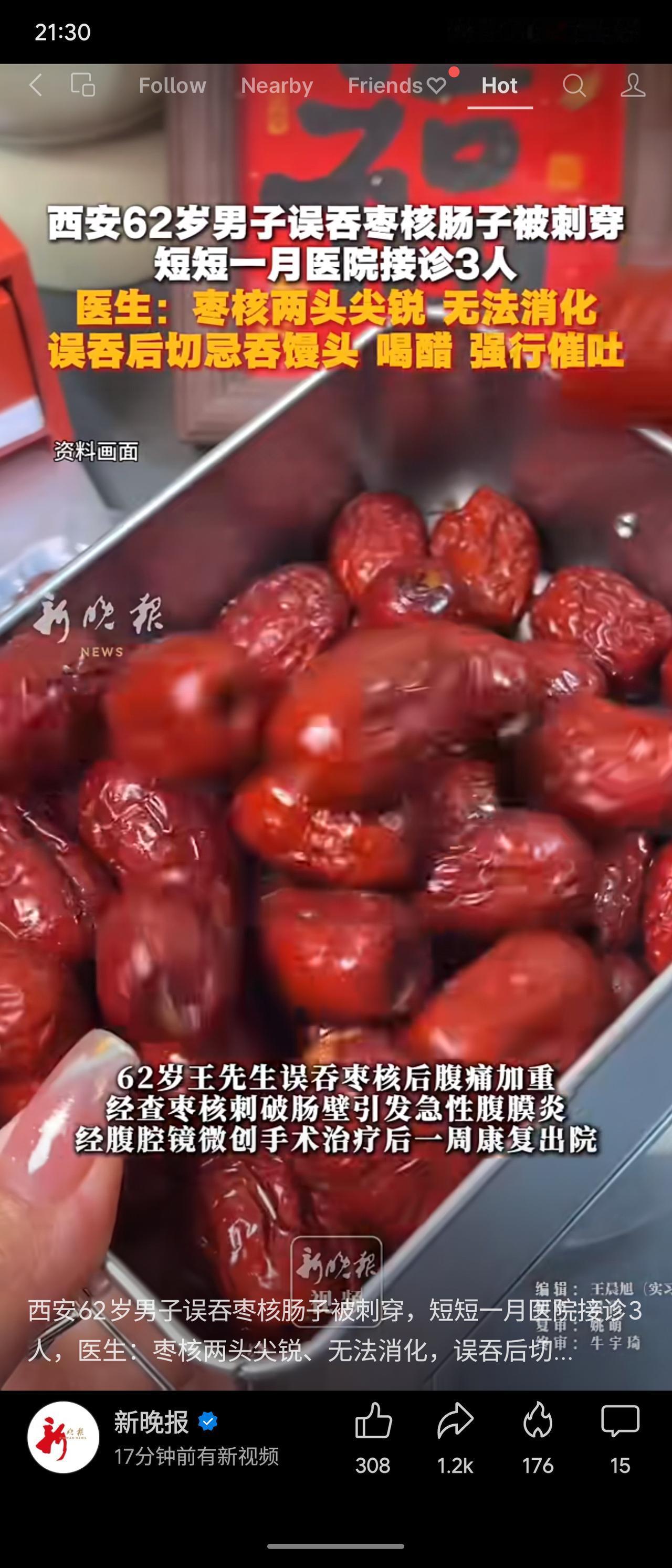 西安62岁男子误吞枣核致肠穿孔,引发急性腹膜炎,经微创手术康复。短短一月该院接诊3例类似患者。医生提醒:枣核两头尖锐且无法消化,误吞后切忌吞馒头、喝醋或强行催吐,出现剧烈腹痛、发烧须立即就医。
