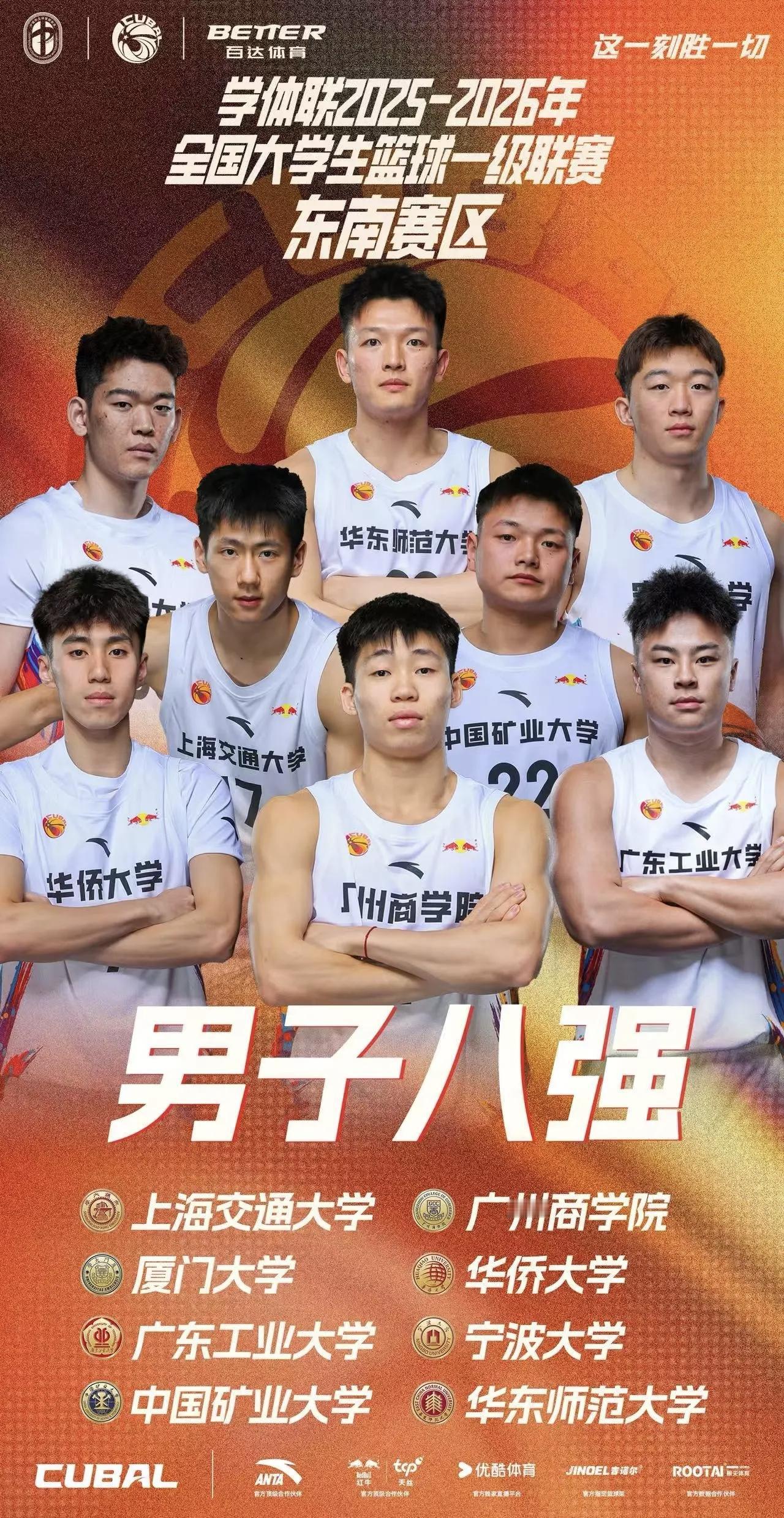 东南赛区男子组八强分别为华侨大学、广州商学院、厦门大学、中国矿业大学、华东师范大学、宁波大学、广东工业大学。其中前6名可以直接晋级全国大学生篮球联赛32强,4大赛区的7-10名需要通过附加赛争夺8个名额。