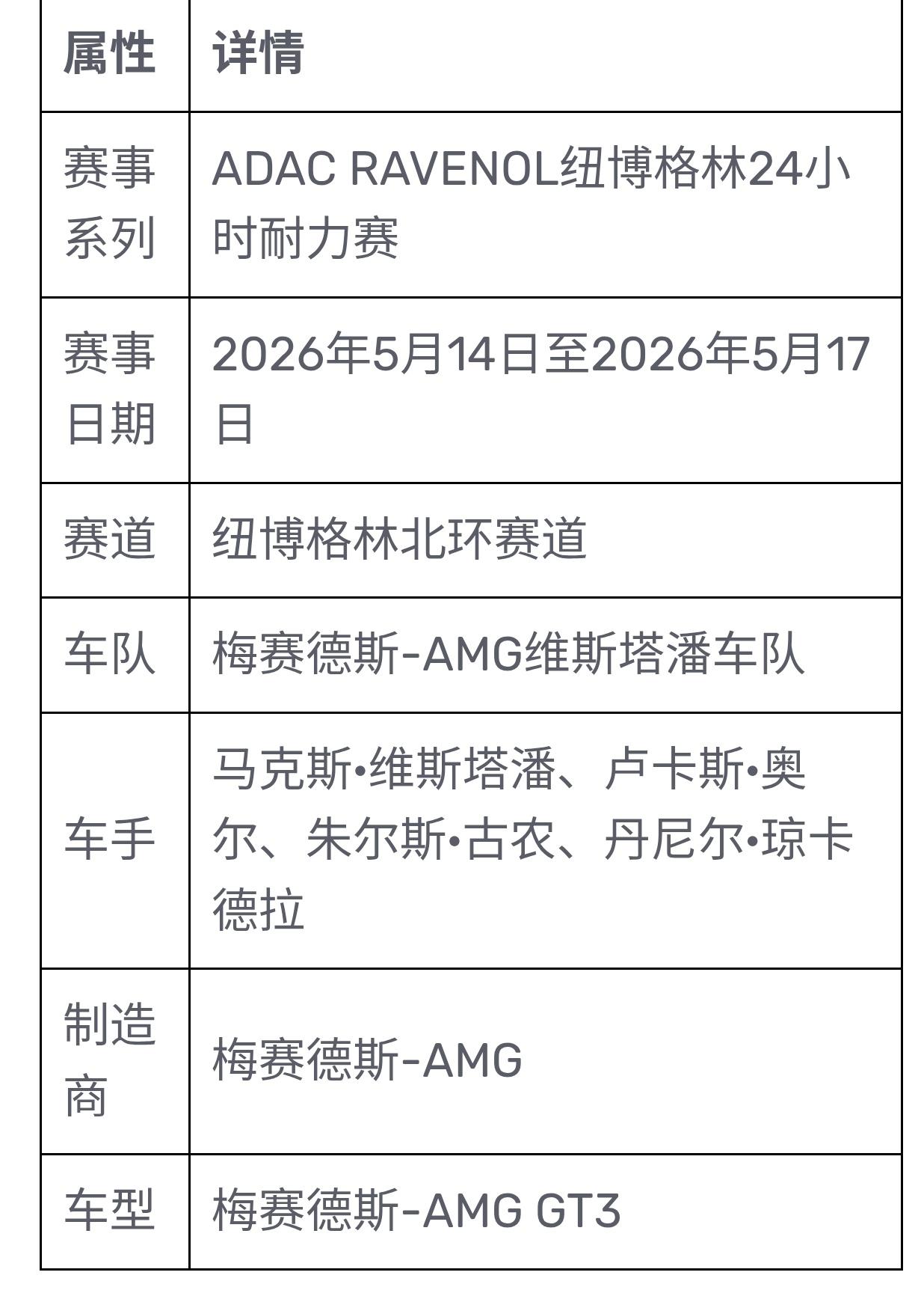 维斯塔潘这次代表的是梅赛德斯-AMG 维斯塔潘车队,开的是梅赛德斯-AMG GT3赛车,车牌号跟他F1一样是3号。他的三位队友分别是卢卡斯·奥尔(奥地利)、朱尔斯·古农(法国)和丹尼尔·琼卡德拉(西班牙),全是GT赛场的老江湖了。
