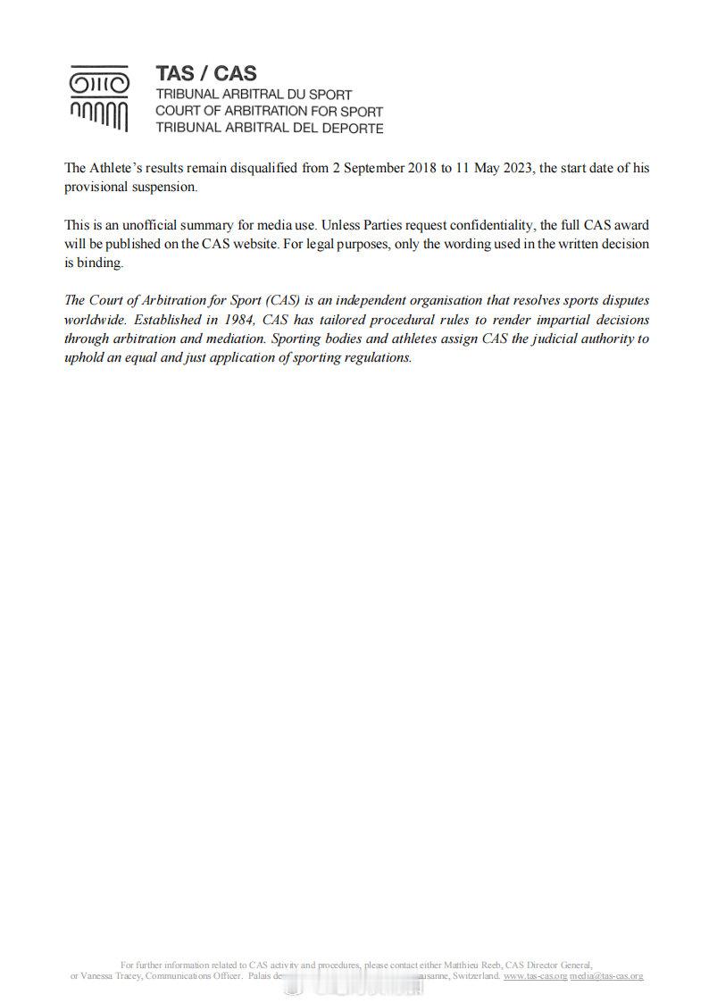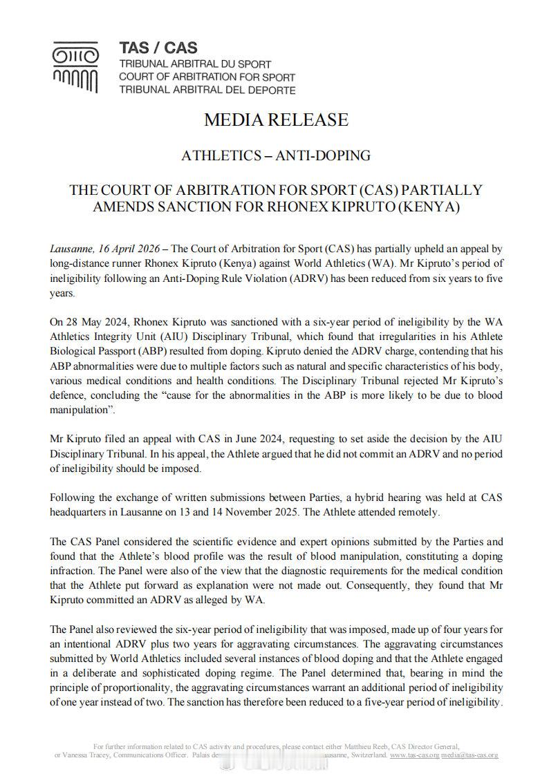 26:24路跑10公里世界纪录保持者 Rhonex Kipruto 就生物护照异常被世界田径诚信委员会 AIU 处罚一事 网页链接 上诉的结果,CAS 体育仲裁法庭部分听取了他的意见,将原有的6年禁赛缩短至5年。