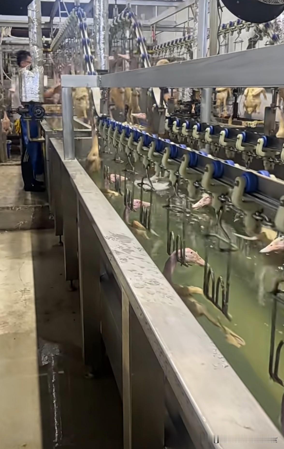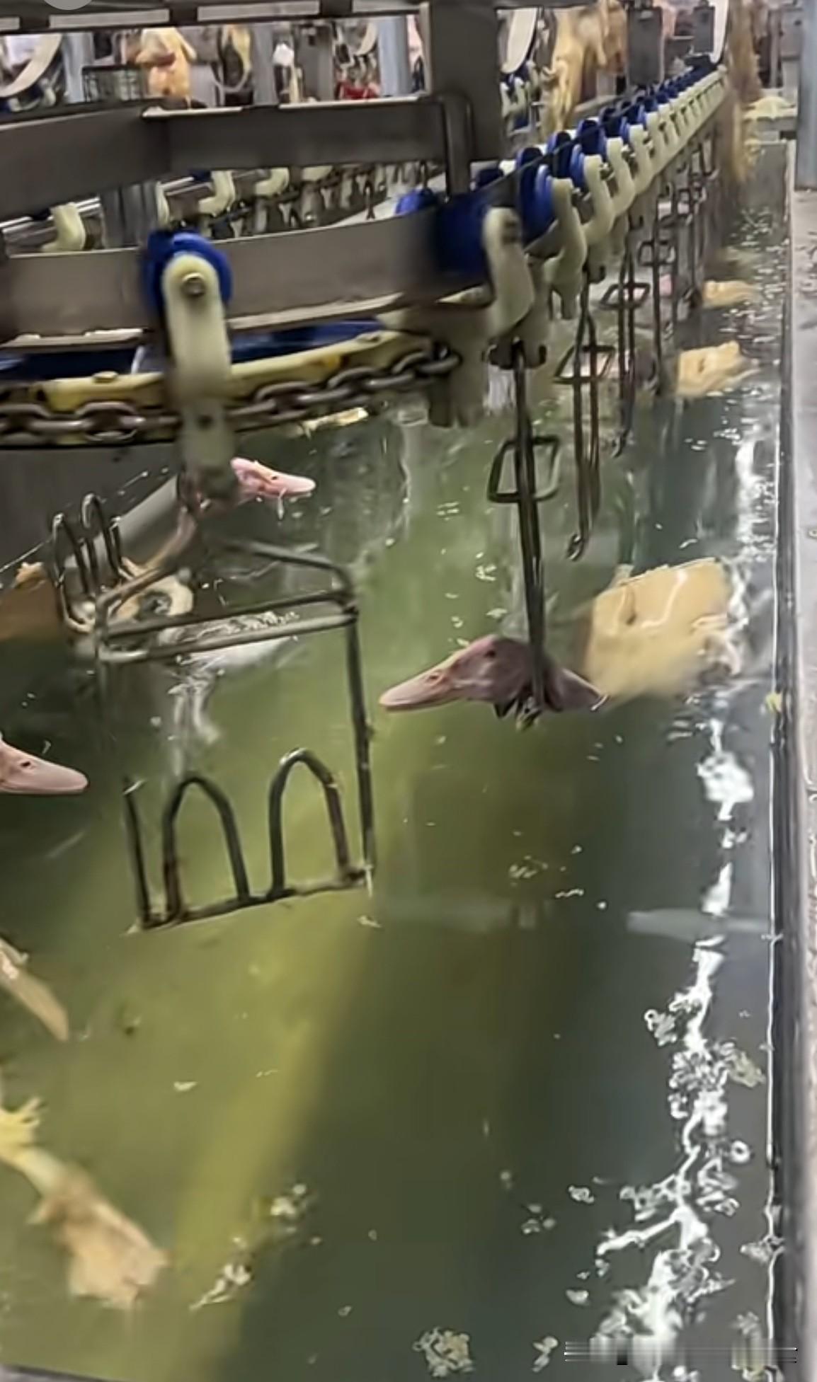 鸭子万万没想到以这种方式下一次水,活的时候没下过水,死了才洗一次澡[汗] 这种白条鸭一般几十天就可以出栏,根本没有机会下水,一生都在笼子里面吃喝拉撒,有的走几步路都是奢侈,哪有机会接触河流水源?下水的时候已经快是餐桌上的食物!