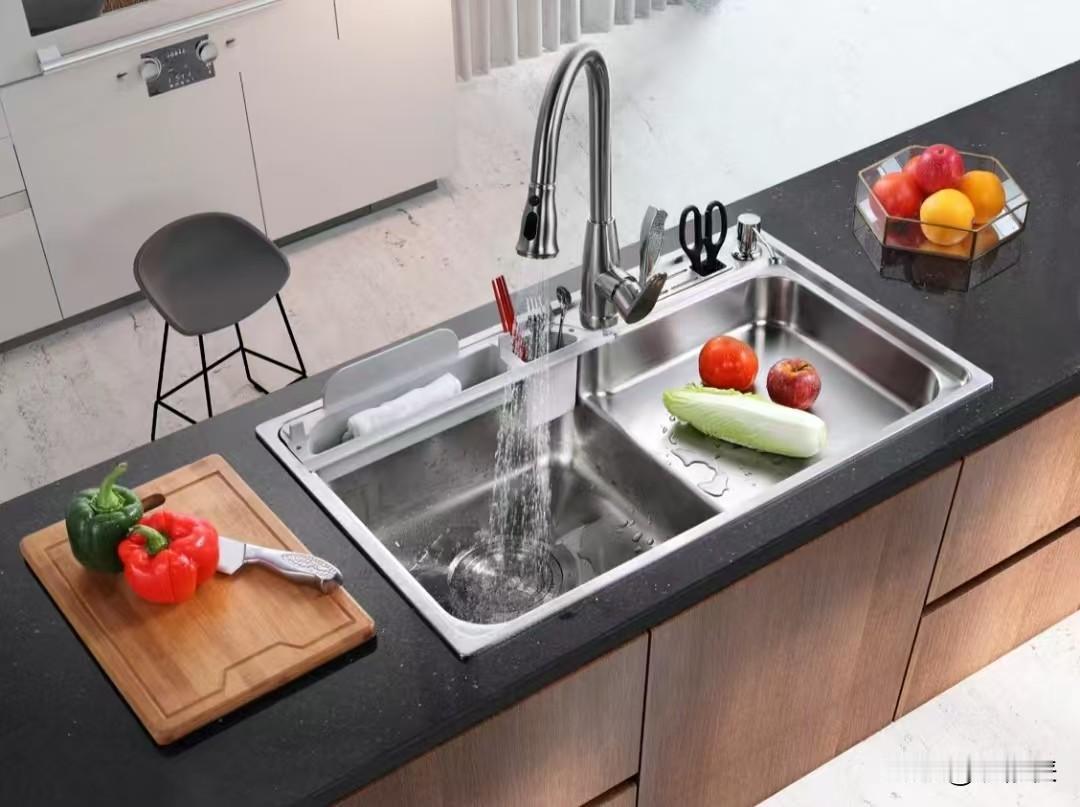 2. 厨房台下盆:颜值高还显整洁,台面水渍一擦就干净,再也不用抠台盆缝隙里的油污,做饭幸福感直接拉满,再也不是之前的“卫生死角重灾区”。
