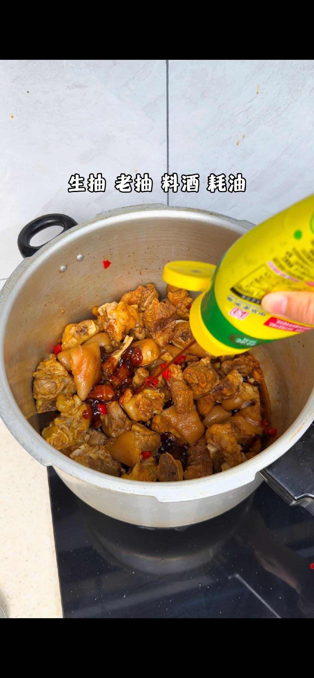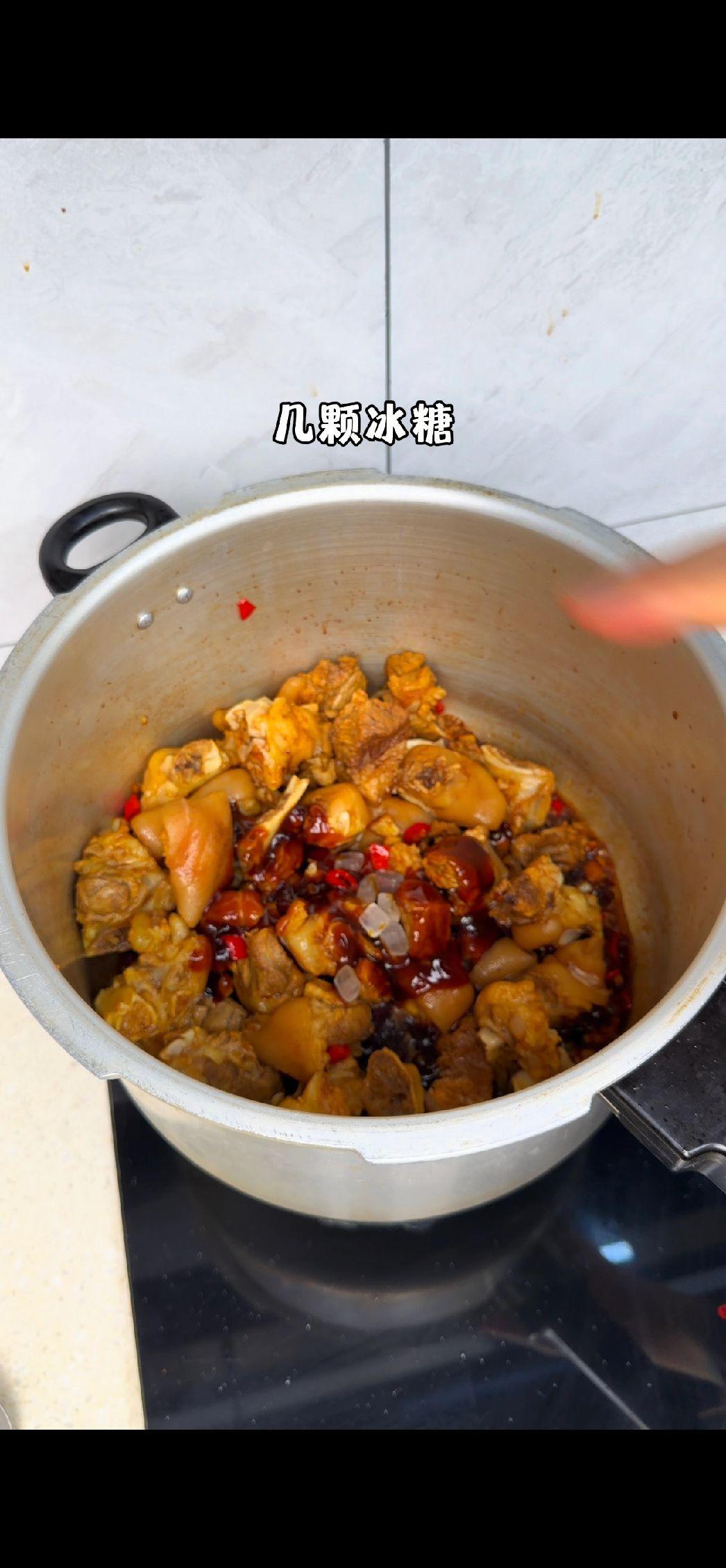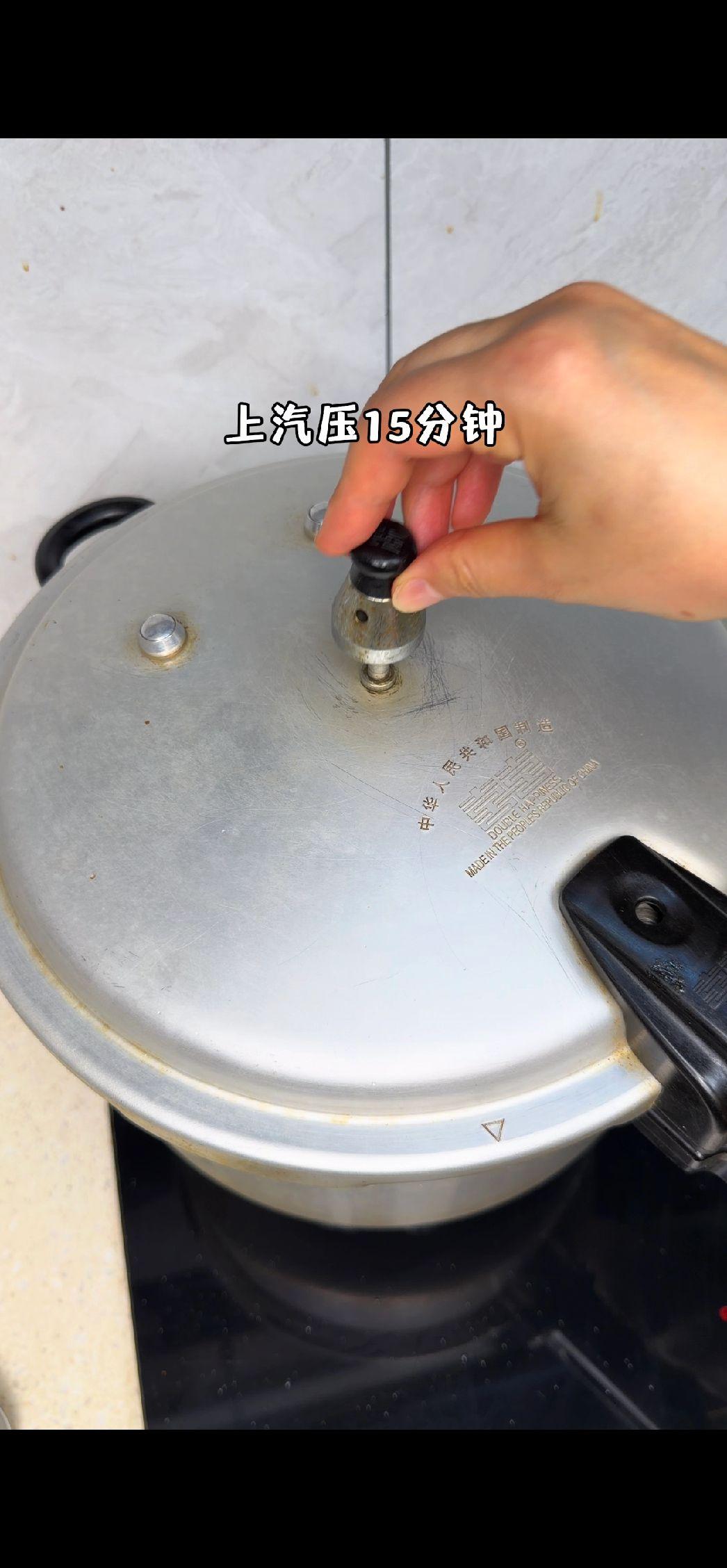 4️⃣焖煮入味:加适量清水没过猪脚,用高压锅上汽压15分钟,省时又好吃!