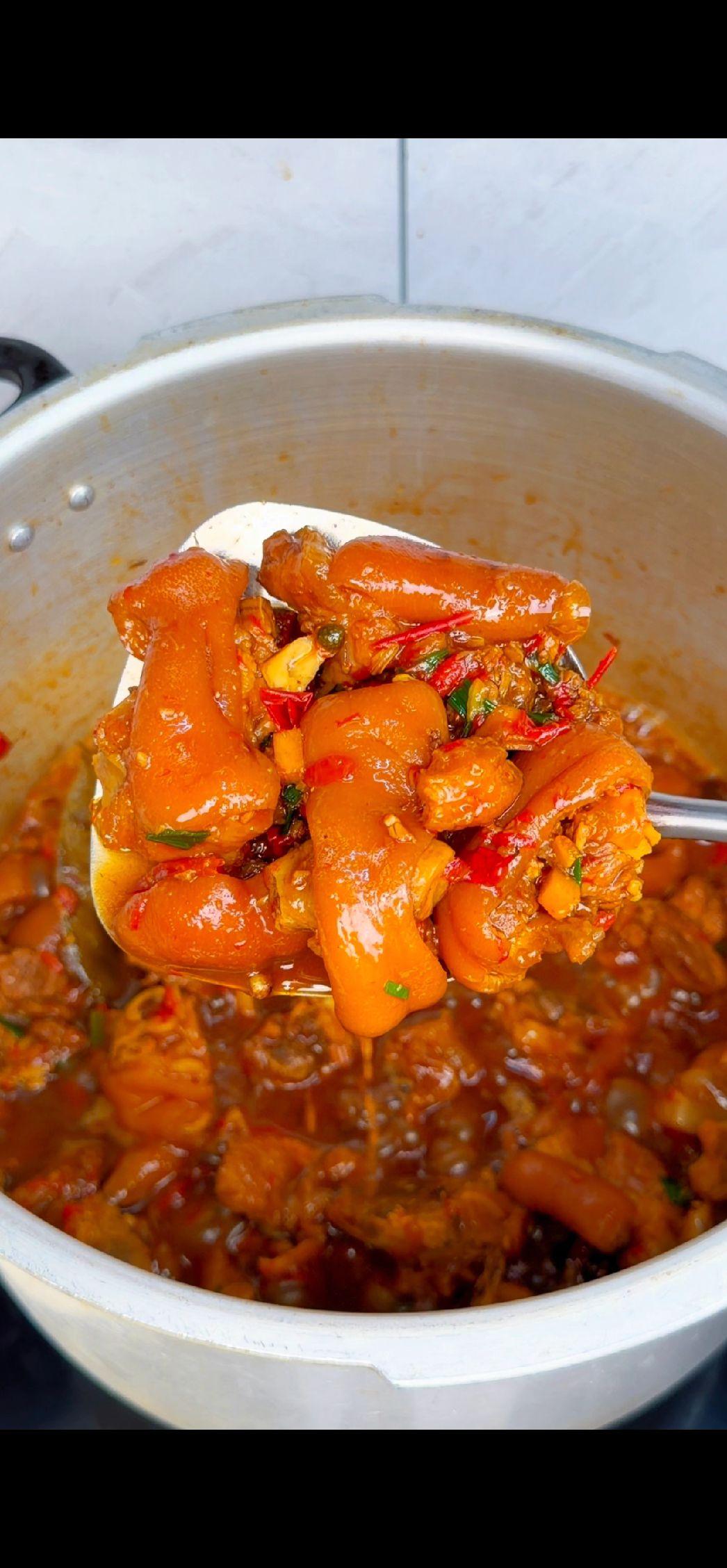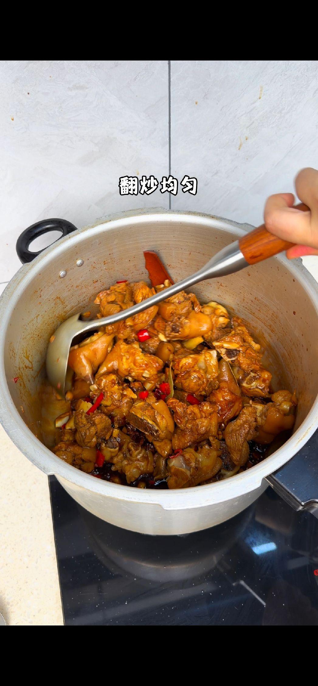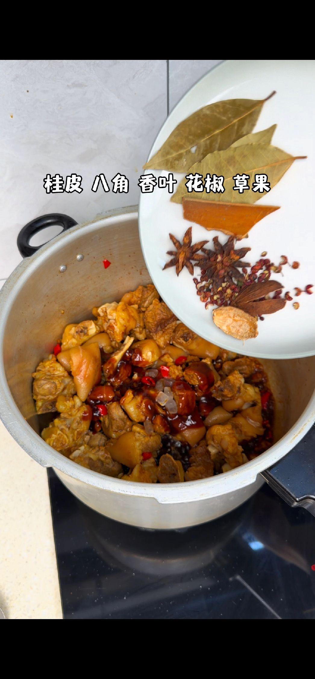 4️⃣焖煮入味:加适量清水没过猪脚,用高压锅上汽压15分钟,省时又好吃!