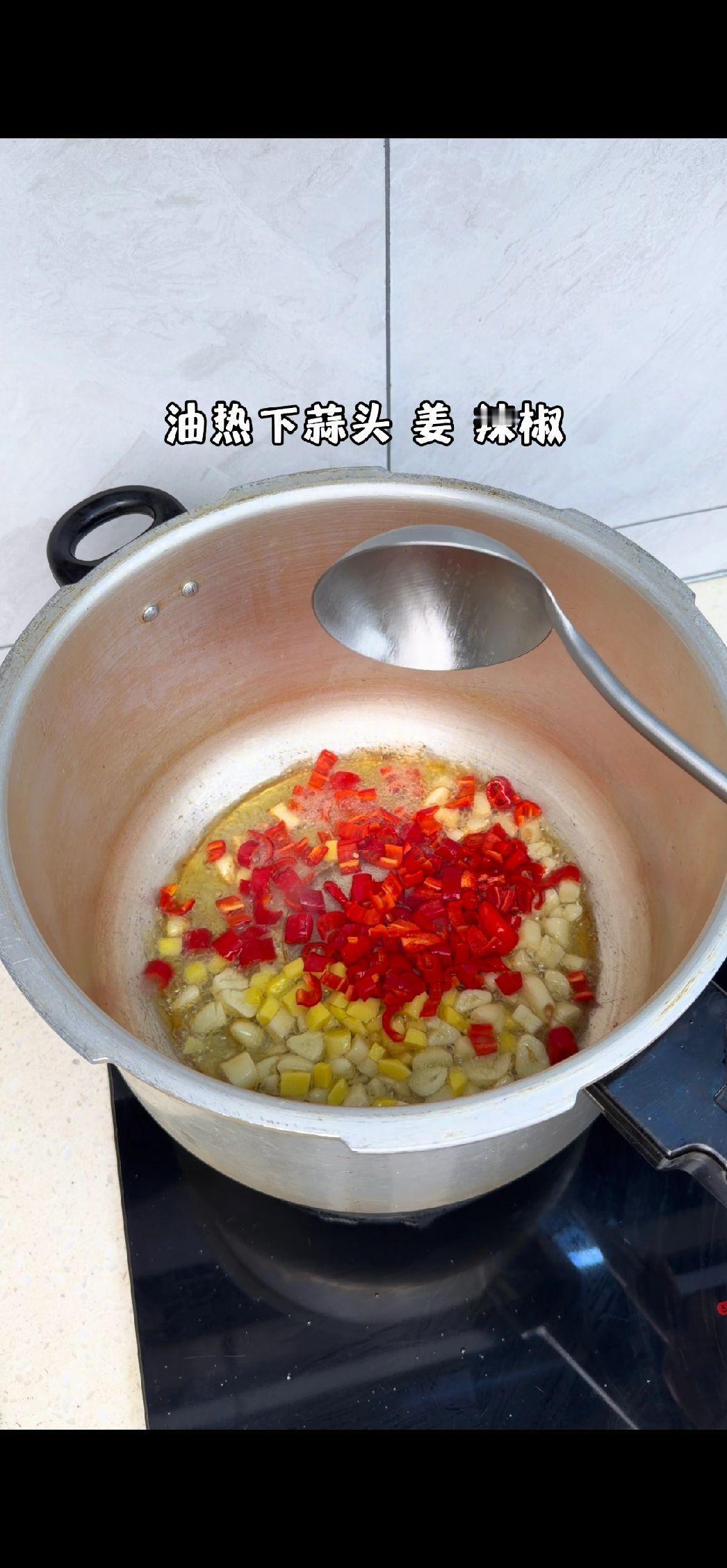 2️⃣爆香配料:油热后放入蒜末、姜片、辣椒炒香,倒入猪脚翻炒至表面微焦。