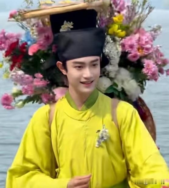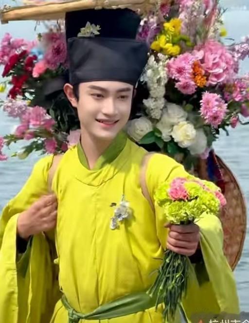 他头戴黑色官帽,衣袂飘飘,背后的花筐里堆着粉的牡丹、白的绣球、黄的迎春,还有几枝带着露水的晚樱,把春日的生机都盛在了这一方竹编里。手里捧着一小束刚摘的花,眉眼间带着温和的笑意,走在垂柳依依的湖边,恍惚间让人以为是从《白蛇传》的画卷里走出来的书生,正赴一场与西湖的春日之约。