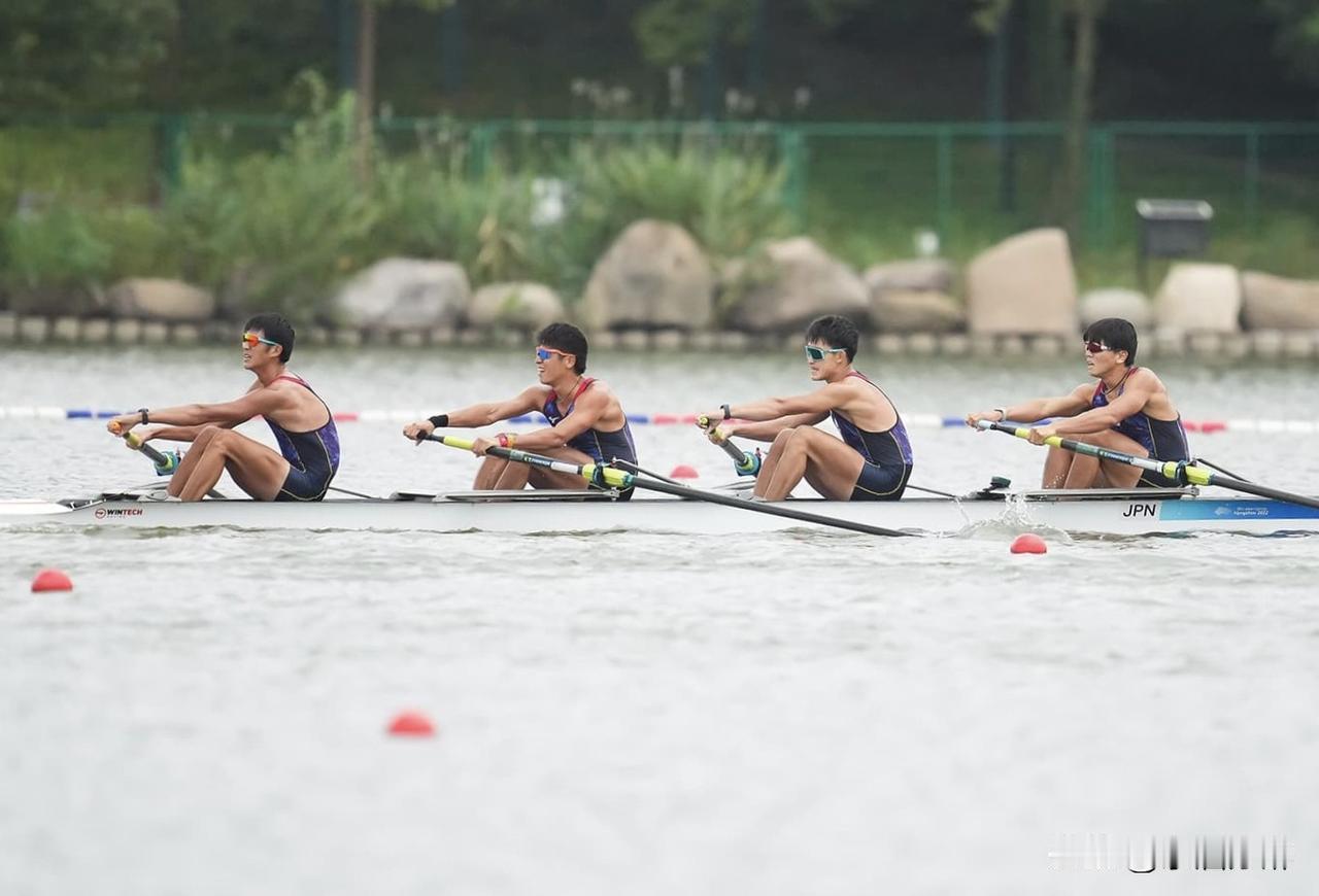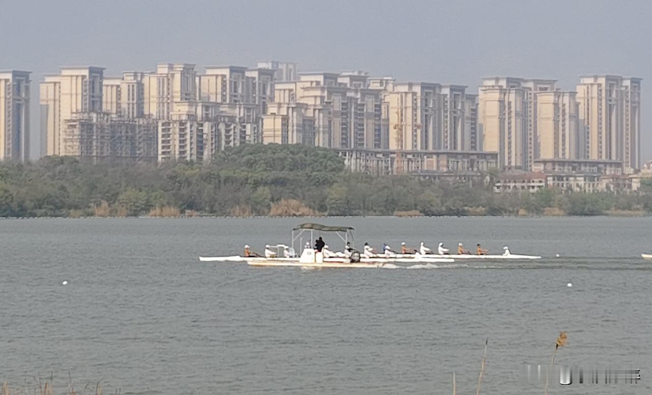 运动员争先恐后奋力划桨,后边乘快艇的教练一旁指导,用大喇叭喊技术要领。