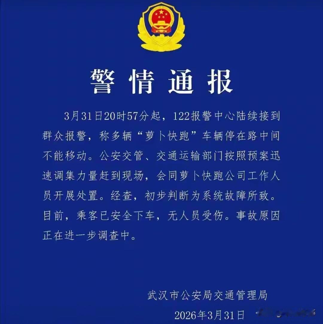 3月31号晚间,武汉警方发布消息称,从晚上20:57分起陆续接到群众的报警电话,多辆“萝卜快跑”无人驾驶车突然停在马路中间无法移动。