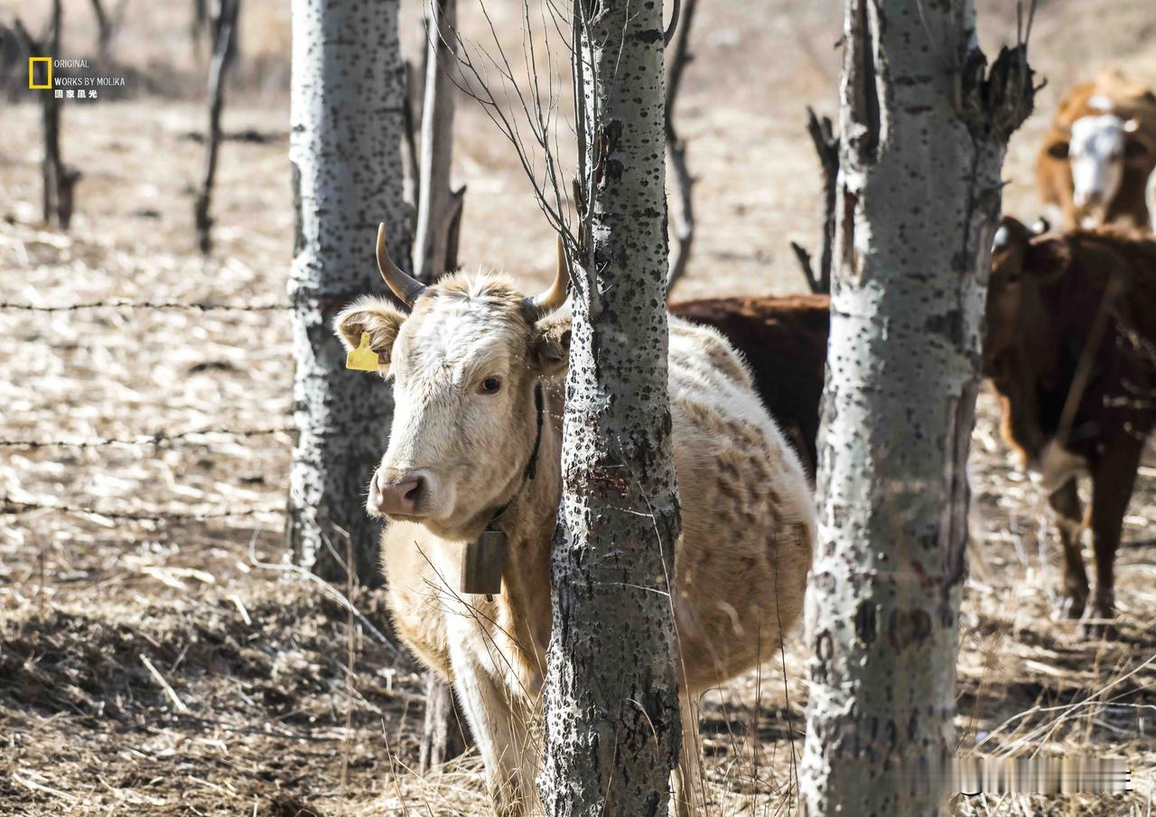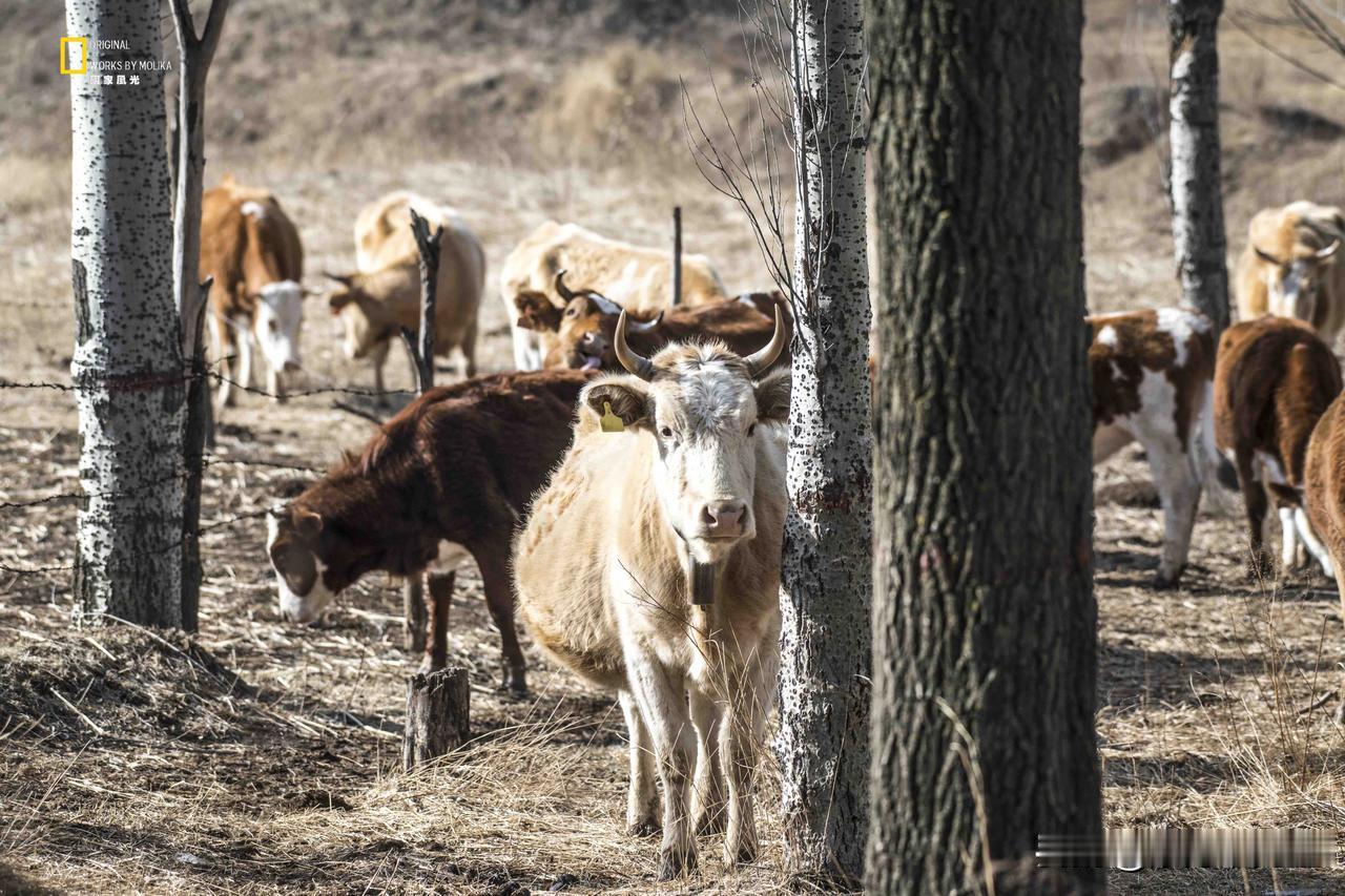 暖阳穿过疏林,落在牛群棕白相间的皮毛上,像是给这片枯寂的林地缀上了鲜活的色块。老