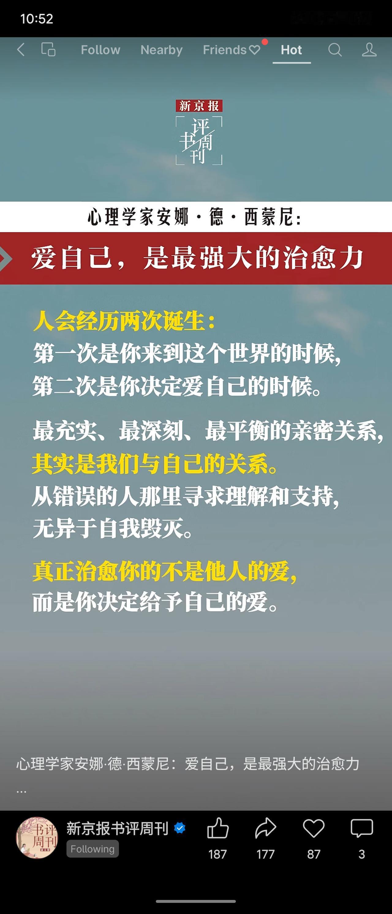 心理学家安娜·德·西蒙尼说:人经历两次诞生,第一次是来到世界,第二次是决定爱自己。最深刻的亲密关系是与自己的关系。从错误的人那里寻求理解是自我毁灭,真正治愈你的,是你给予自己的爱。