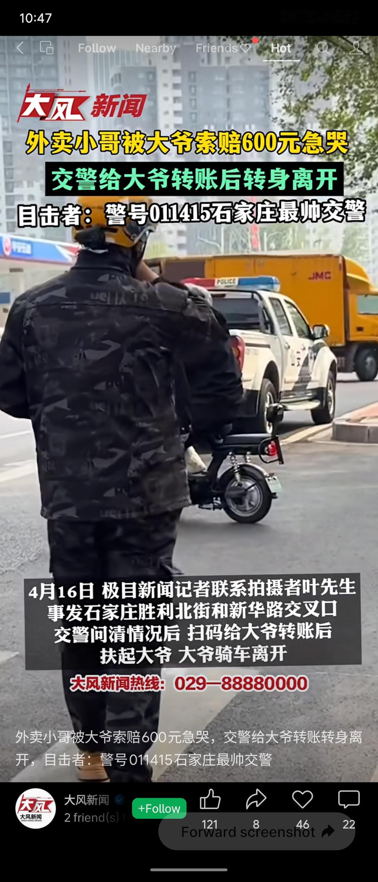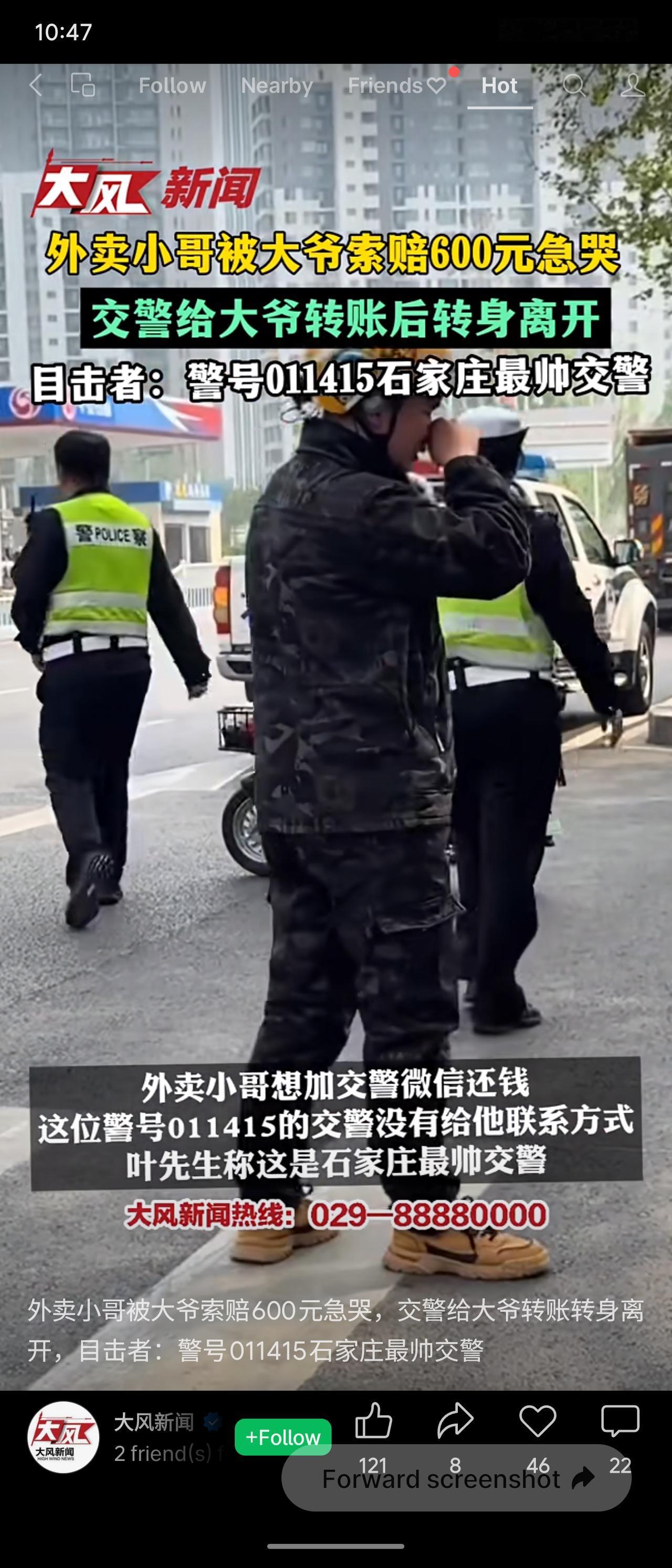 河北石家庄街头,外卖小哥不小心碰到一位大爷,被索赔600元急得抹泪。交警(警号011415)了解情况后,自己扫码转账给大爷,随后扶起大爷并离开。小哥想加微信还钱,交警未留联系方式。目击者称赞:最帅交警。