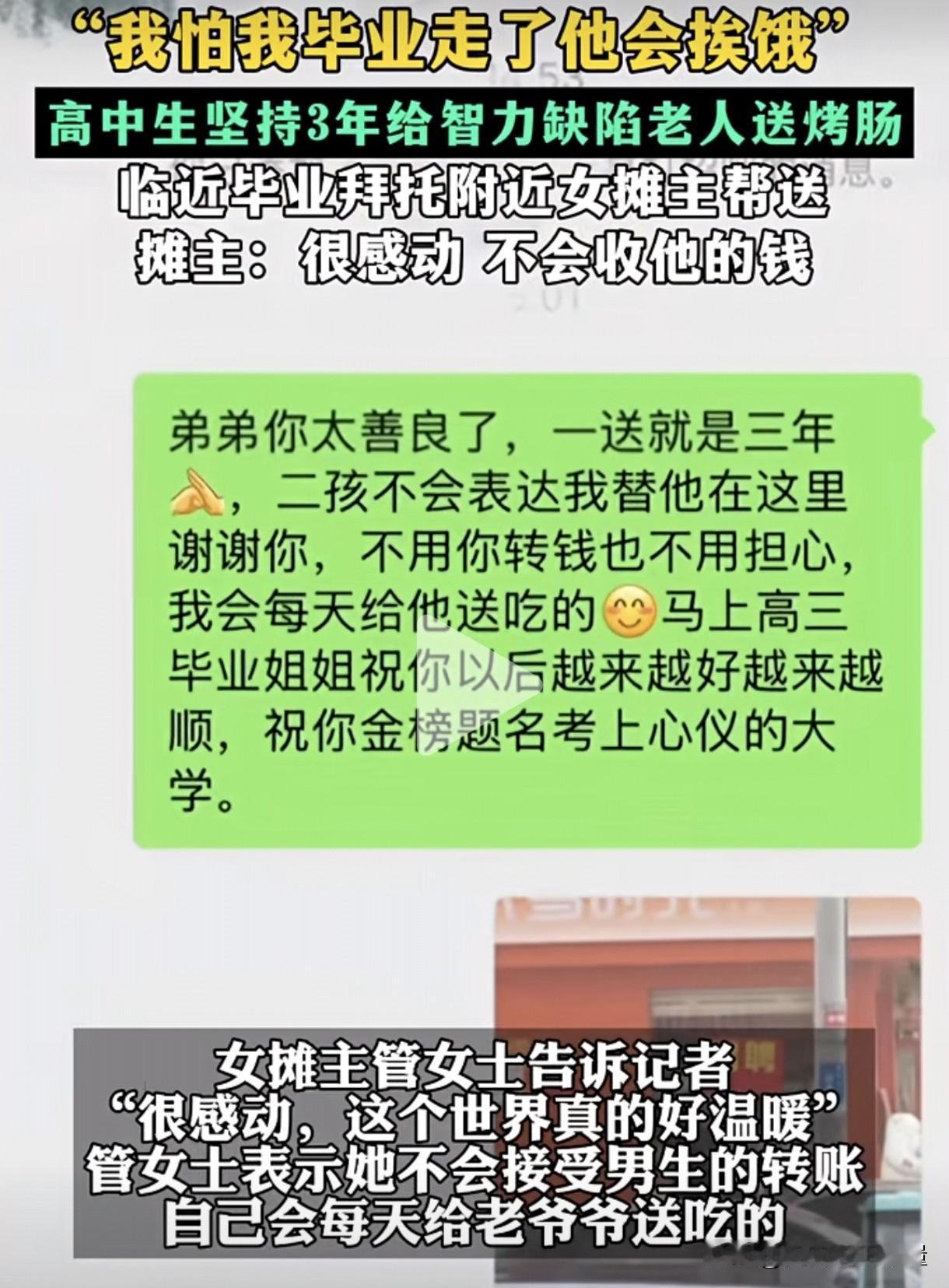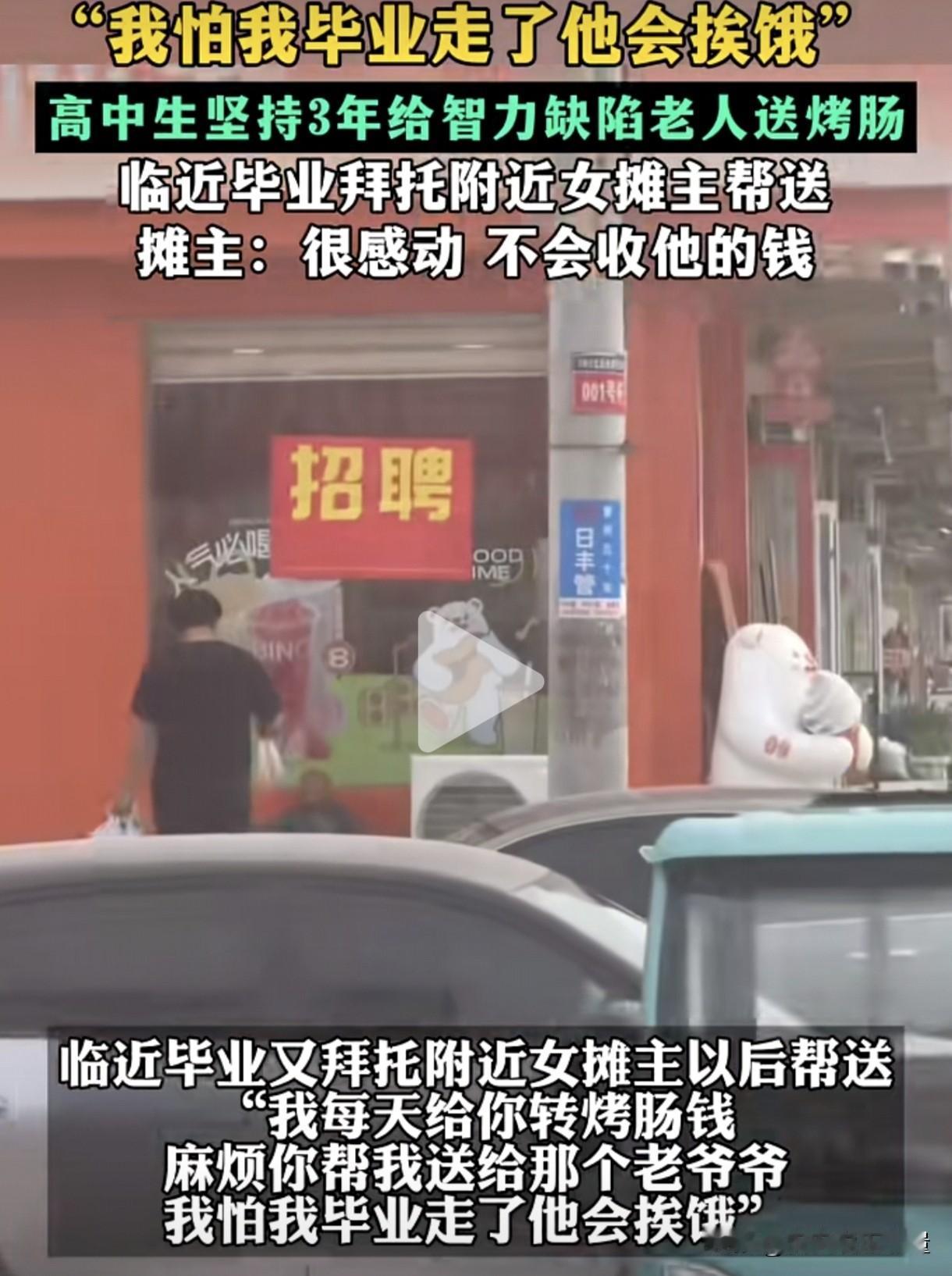 我怕我毕业走了他会挨饿,想拜托你一件事。近日山东潍坊一名在学校周边卖烤肠的老板娘接到一位高三男生的求助。男生告诉她,自己三年来每天都会买一根烤肠给附近一位有智力缺陷的老爷爷吃,现在他高三准备毕业了,担心自己毕业了老爷爷会挨饿,所以想拜托老板娘。以后他每天转钱给老板娘,由老板娘帮送烤肠给老爷爷。
