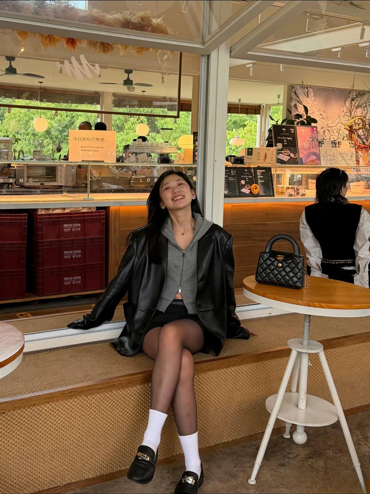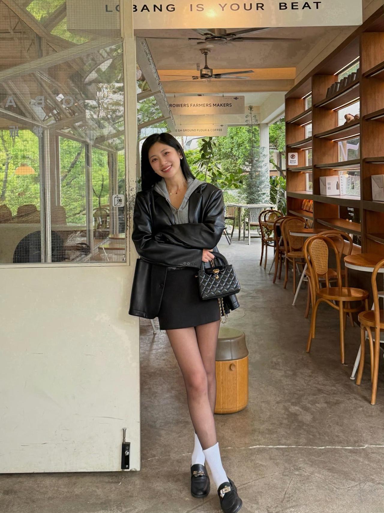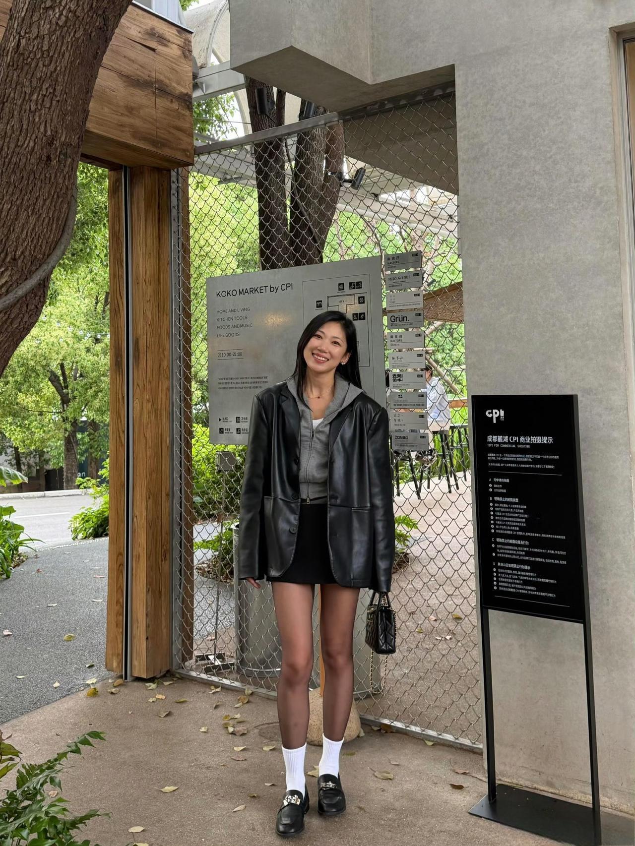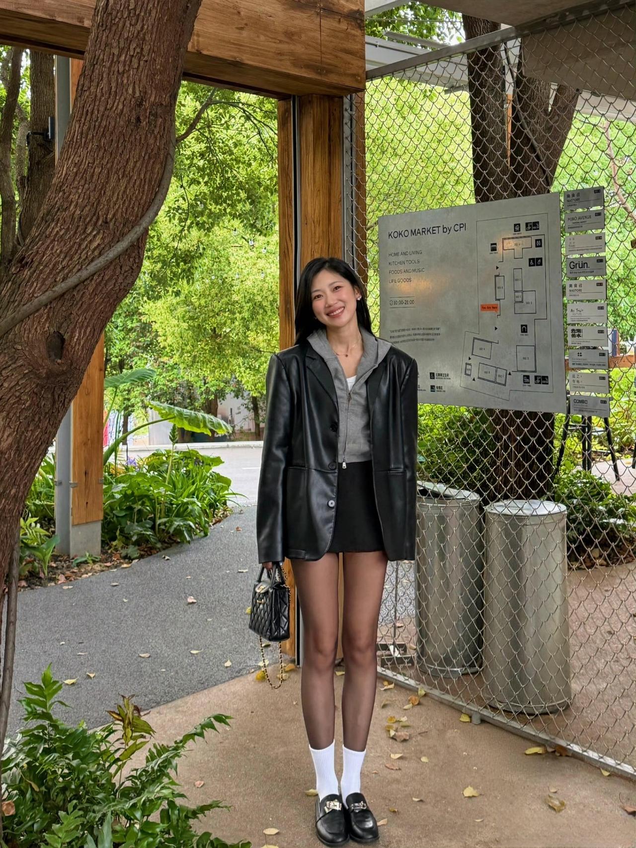 - 下装搭黑短裙+白袜,短裙显腿长,白袜的混搭是甜酷风的小心机,弱化了皮西装的硬朗;