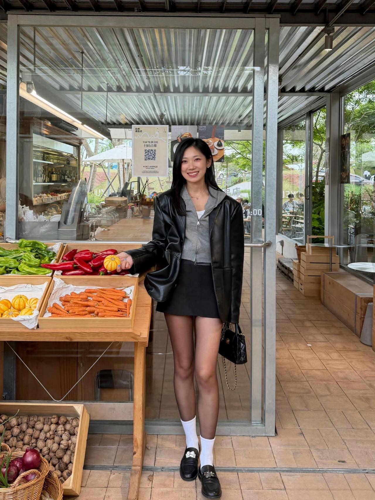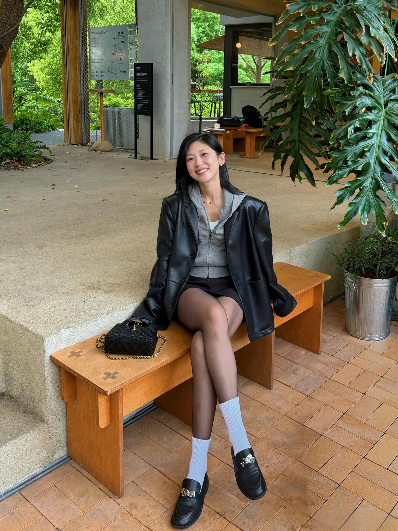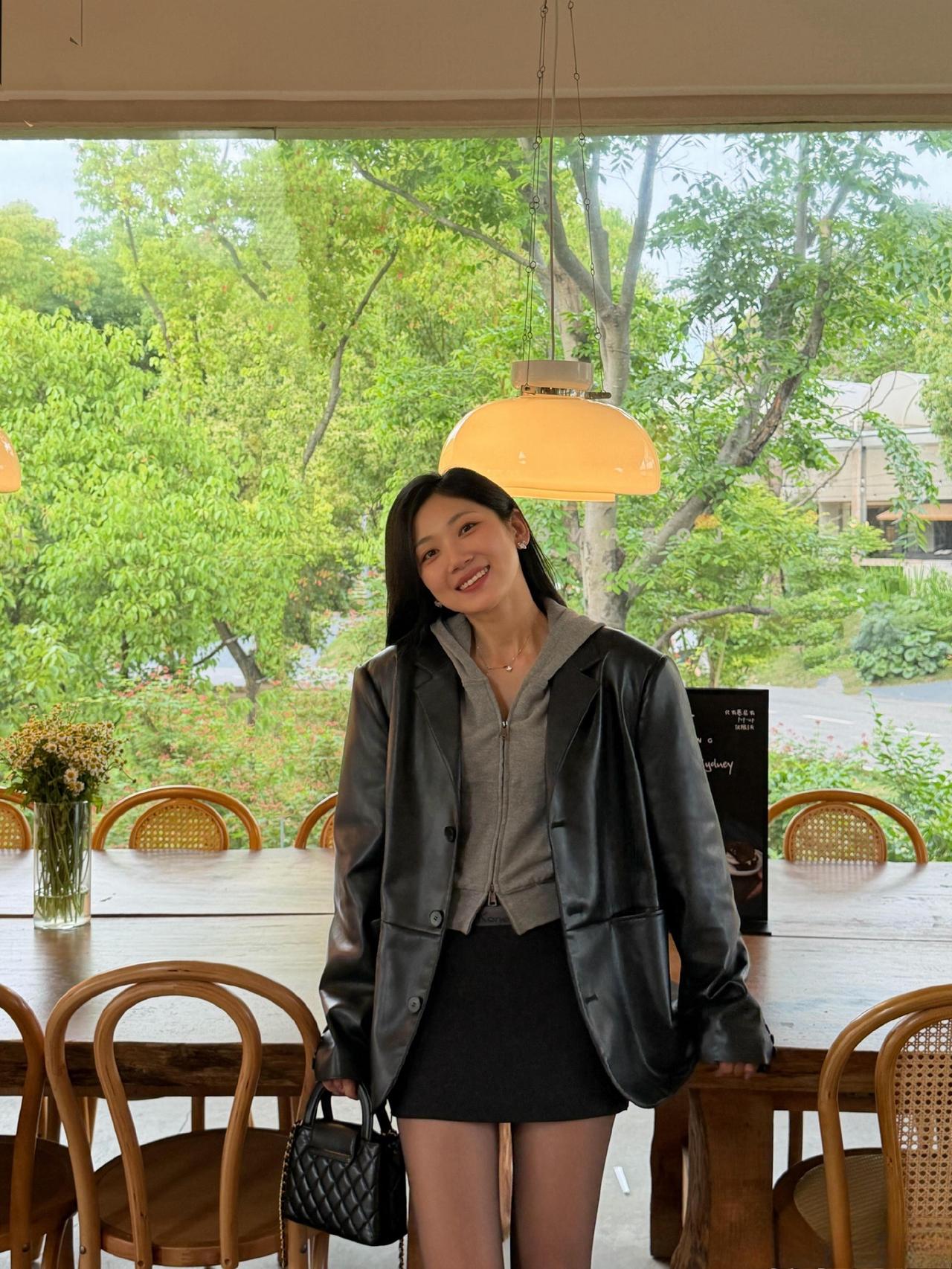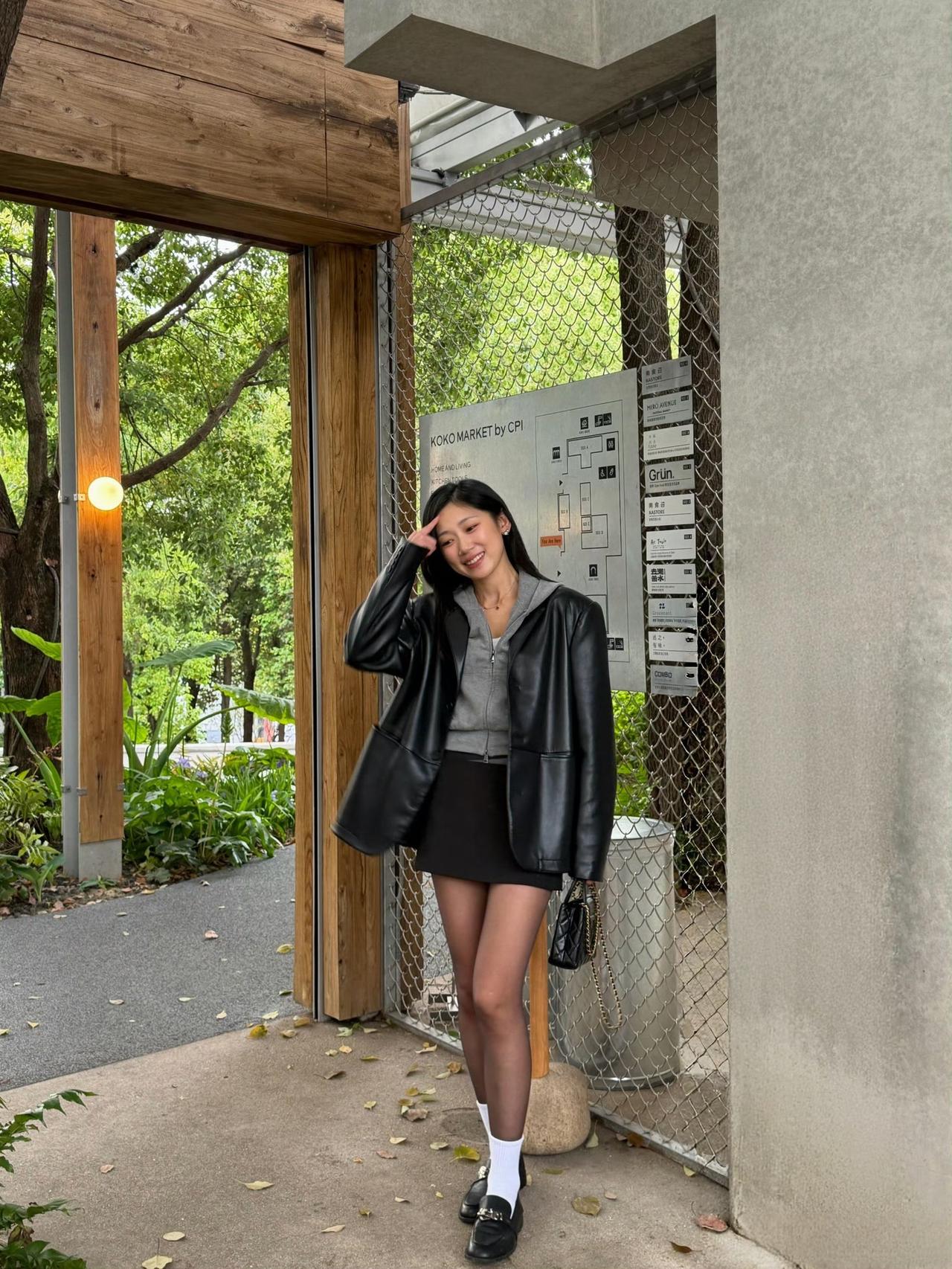 - 下装搭黑短裙+白袜,短裙显腿长,白袜的混搭是甜酷风的小心机,弱化了皮西装的硬朗;