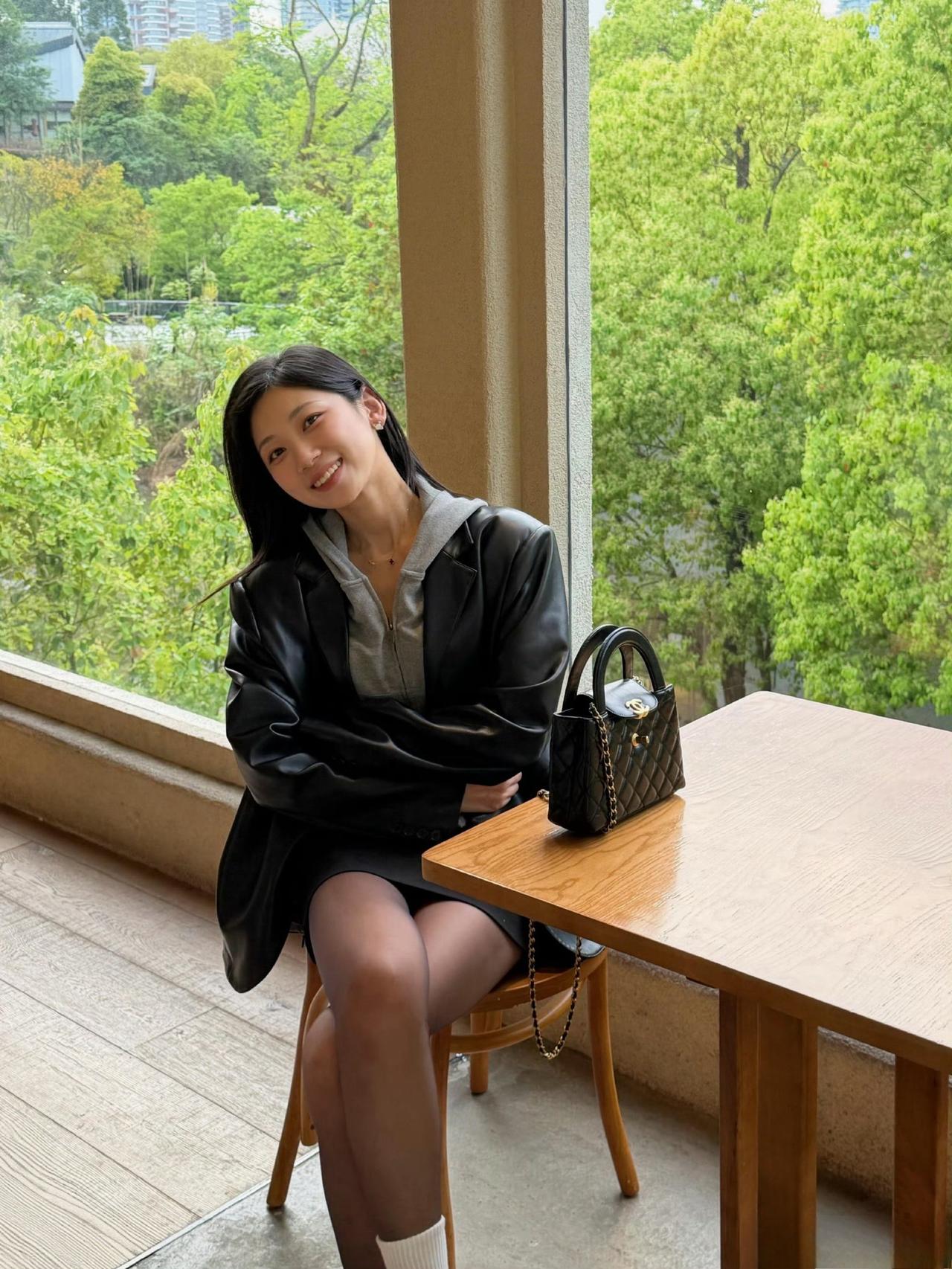 - 配饰用黑色菱格包+乐福鞋,精致包鞋提升整体质感,和混搭风格适配度很高。