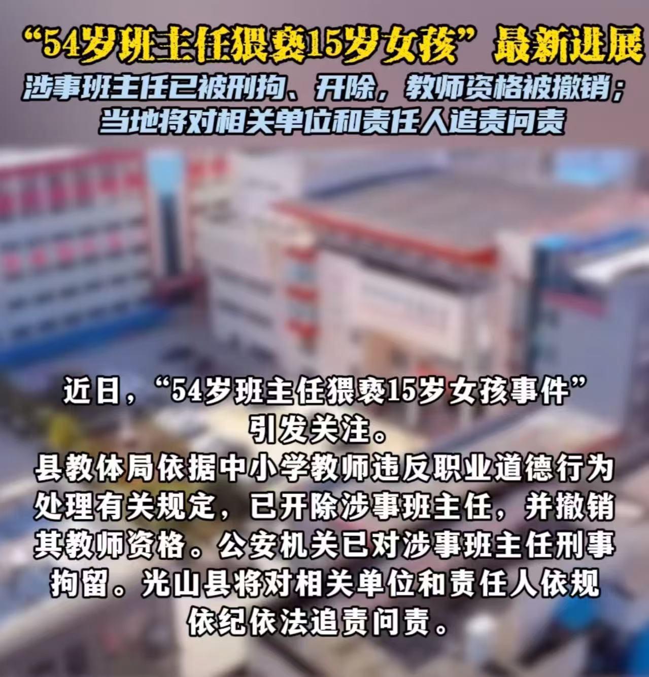 “还是网友给力啊!”河南光山县,54岁班主任刘某猥亵15岁女生,仅对其作出行政拘留10日、降级调岗的处罚。网友不服质疑,事件迎来关键进展,涉事教师被开除并撤销教师资格,同时被刑事拘留,当地还将对相关单位和责任人追责问责!