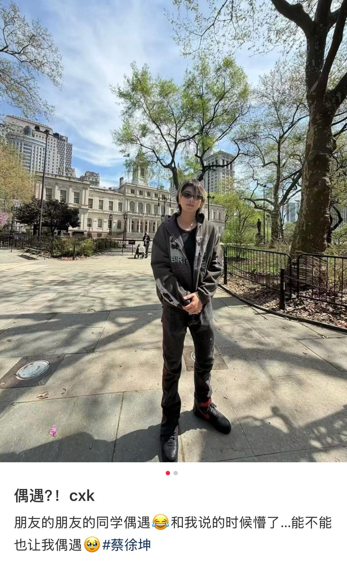 蔡徐坤 网友在纽约偶遇蔡徐坤好好笑啊,坤就这样乖乖站着给拍照,广角+如此权威的摄