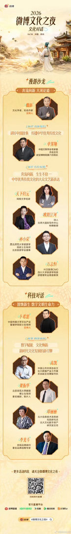 微博文化之夜全阵容微博文化之夜 让文化被看见,让传承被听见。2026微博文化之夜即将启幕,全阵容重磅揭晓,每一位嘉宾都在用心守护文化根脉。明晚19:00,郑州相见,以热爱致敬传承,共赴这场文化盛宴,不见不散