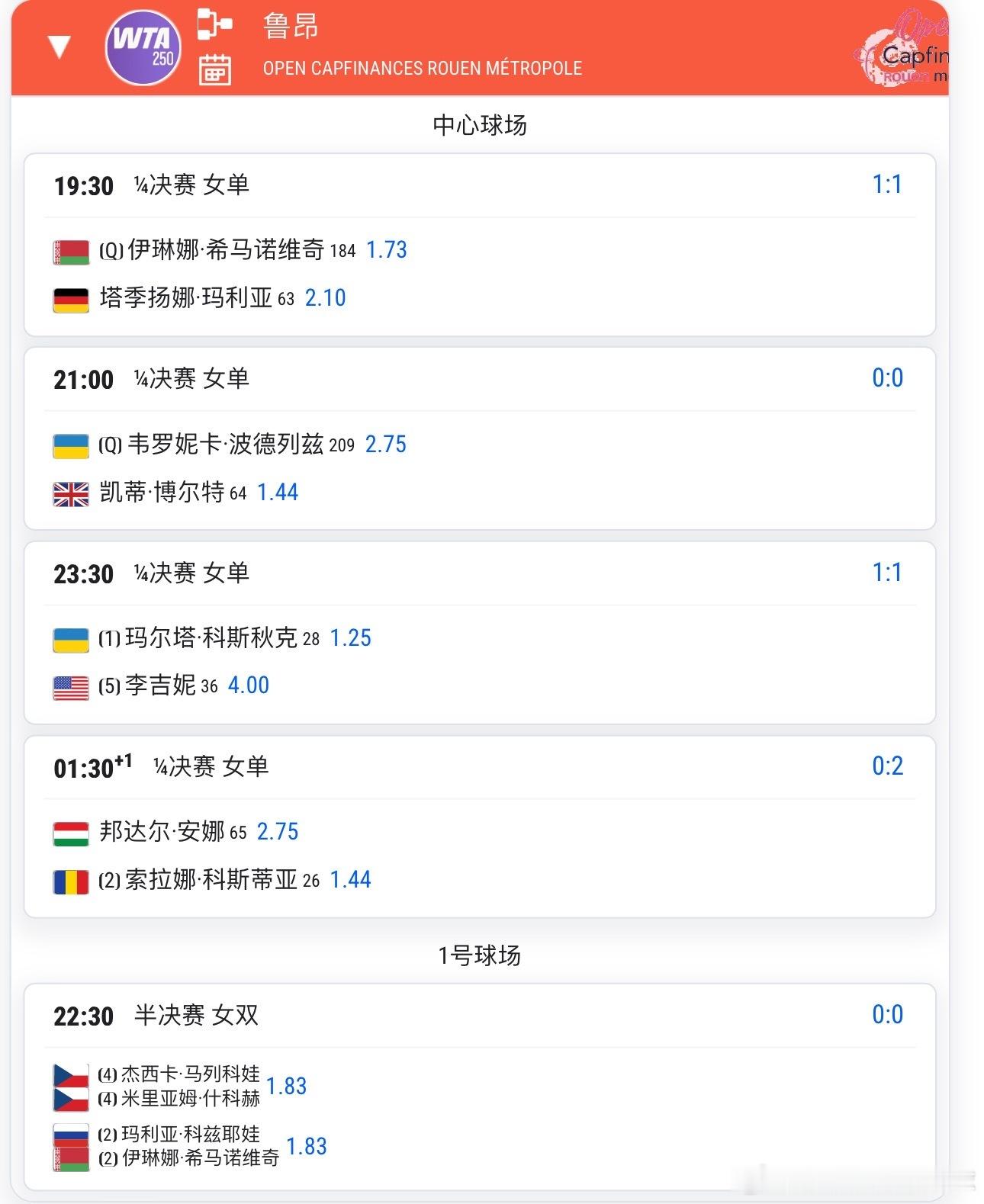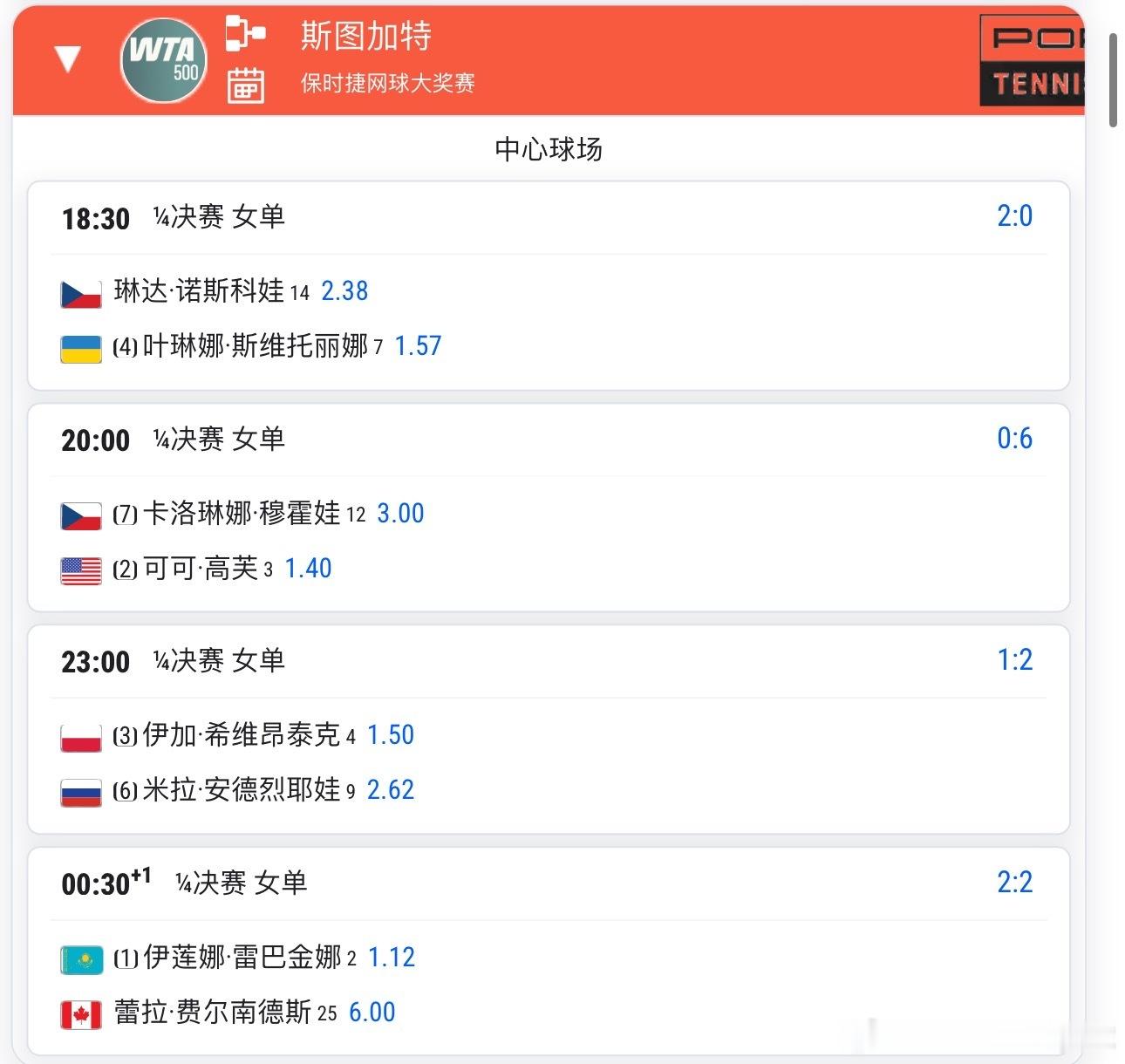 WTA斯图加特 中心场18:30 诺斯科娃🇨🇿vs斯维托丽娜🇺🇦随后 高芙🇺🇸vs穆霍娃🇨🇿