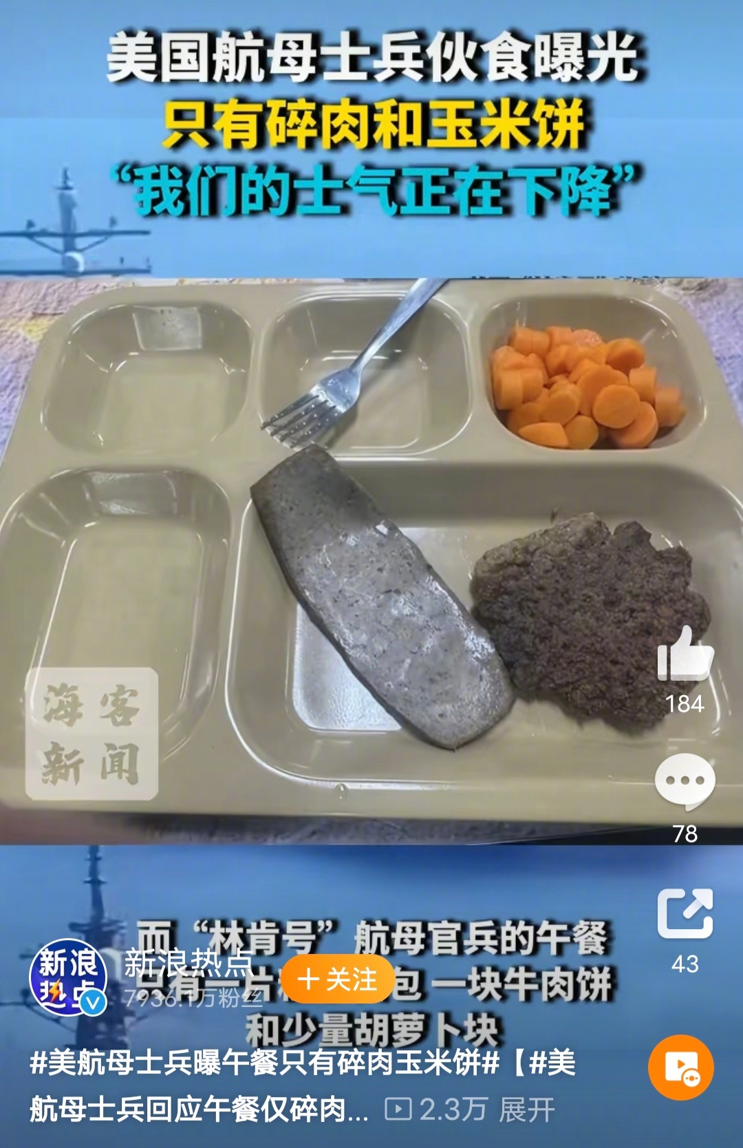 一个坏消息,“的黎波里号”船员午餐只有一勺碎牛肉和两块玉米饼,“林肯号”航母的午餐只有一片粗粮面包、一块牛肉饼和少量胡萝卜块。