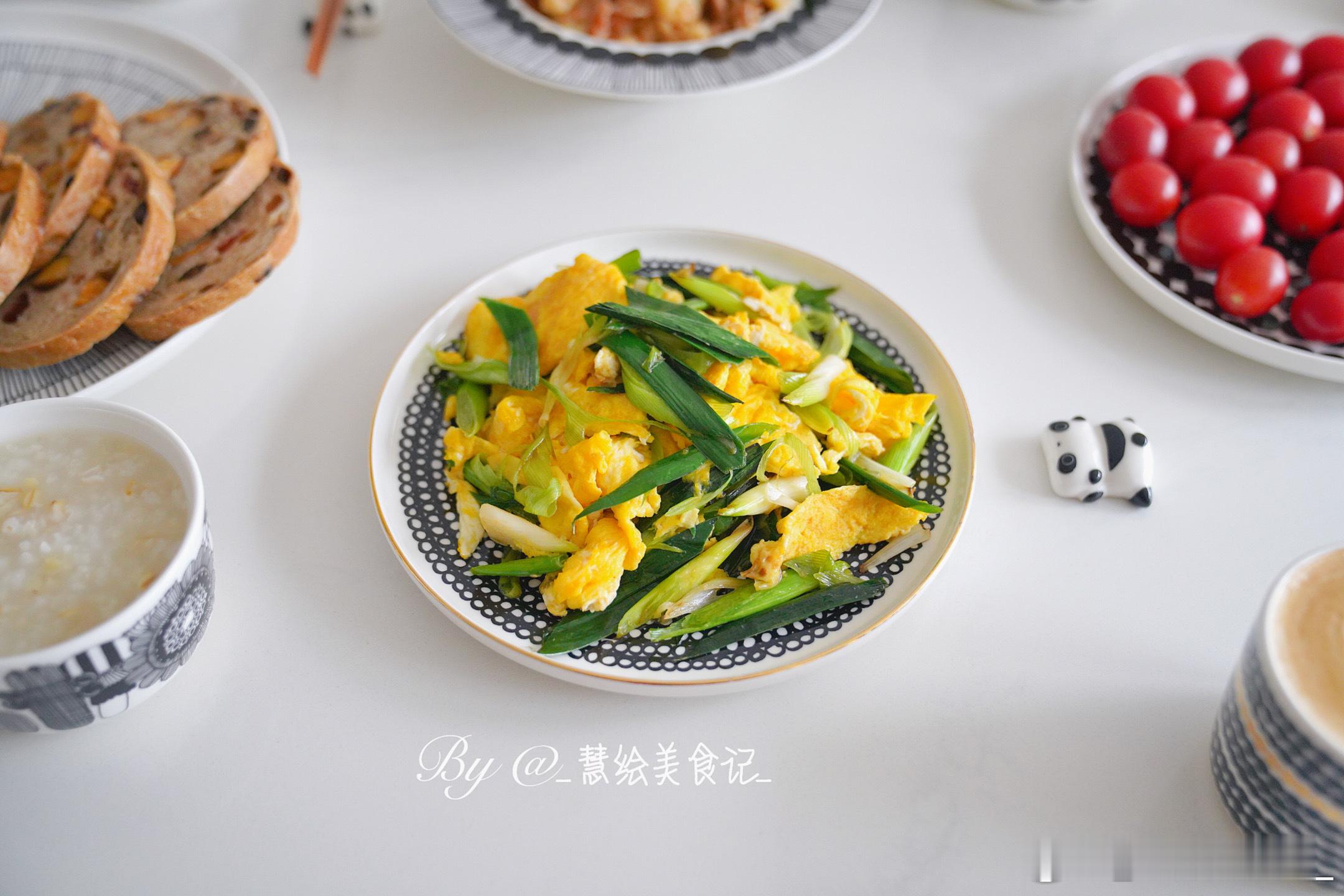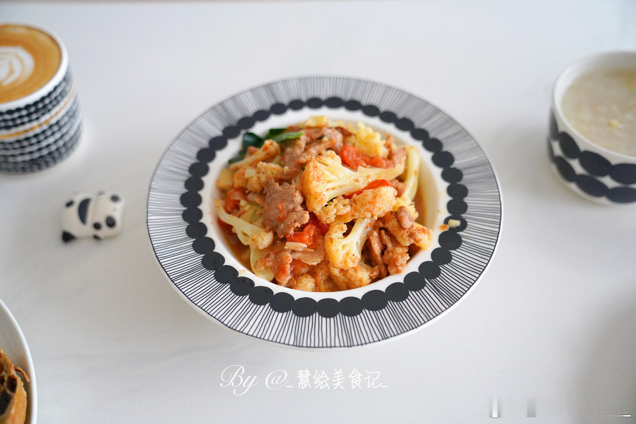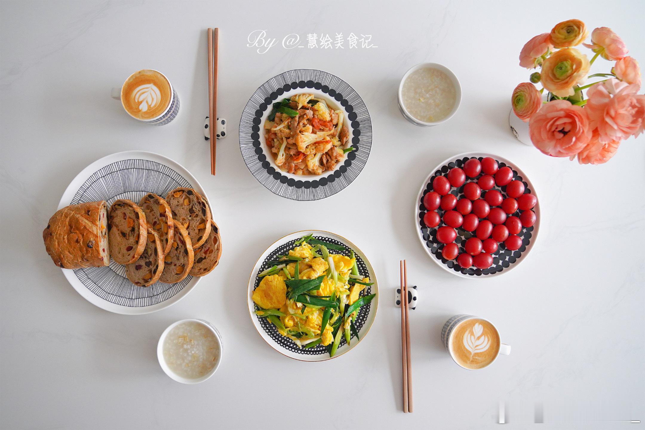 周五啦☕早餐蒜苗炒鸡蛋、番茄花菜、燕麦粥、大列巴、拿铁咖啡、小番茄~我的美食日记