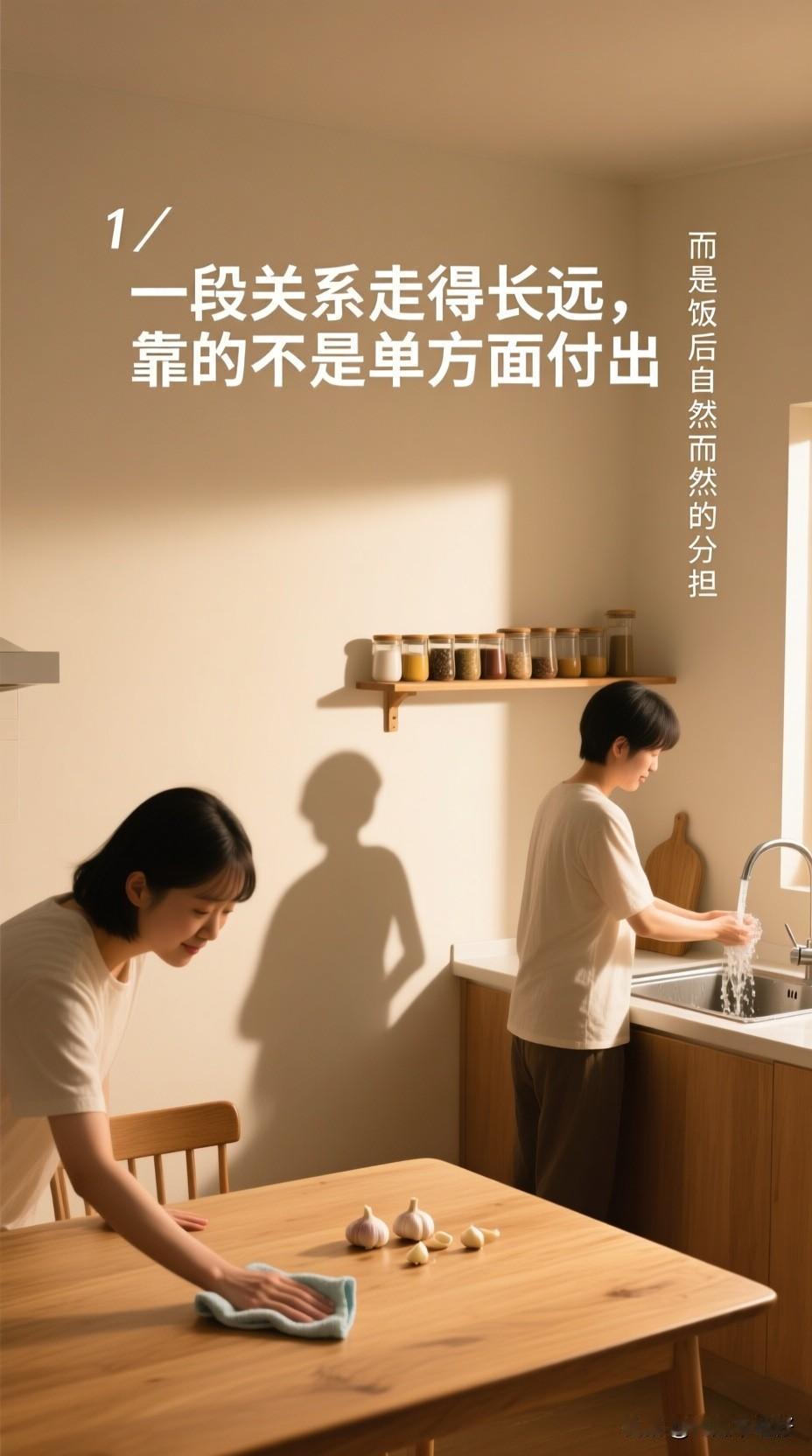 更暖的是饭后。不用谁指挥,一个人收拾碗筷,另一个人就去擦桌子洗碗。这种顺手的分担,比什么情话都让人踏实。