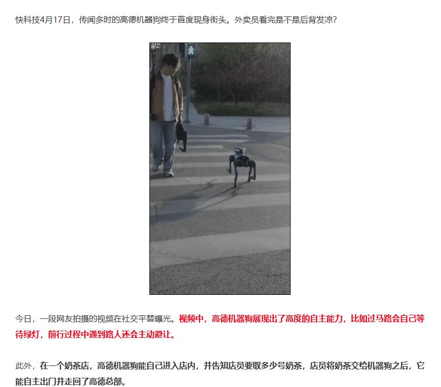 网传内容显示,高德的机械狗近日现身街头。   就功能而言,除了具身智能产品经典的