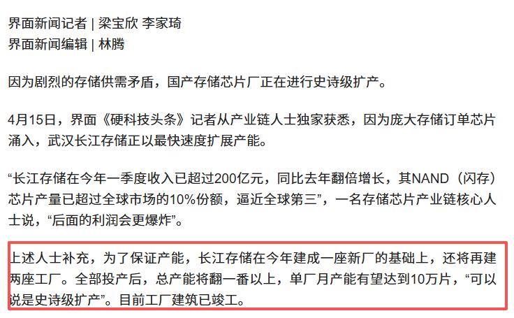 据媒体报道,近日记者获悉受存储订单激增等原因的影响,长江存储不仅在Q1实现了“收入超200亿,同比去年翻倍增长” “NAND产量逼近全球第三”这两大成绩,其还将进行“史诗级扩产”,以此达成总产能翻一番以上的目标。