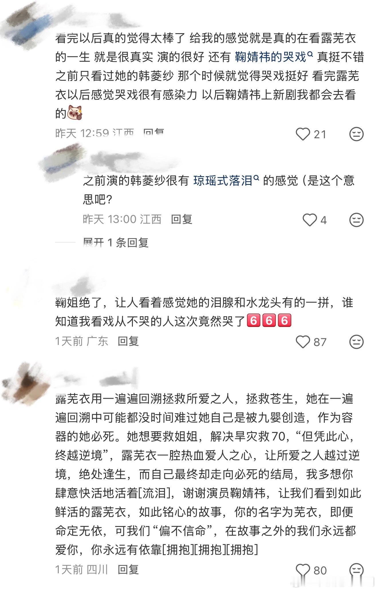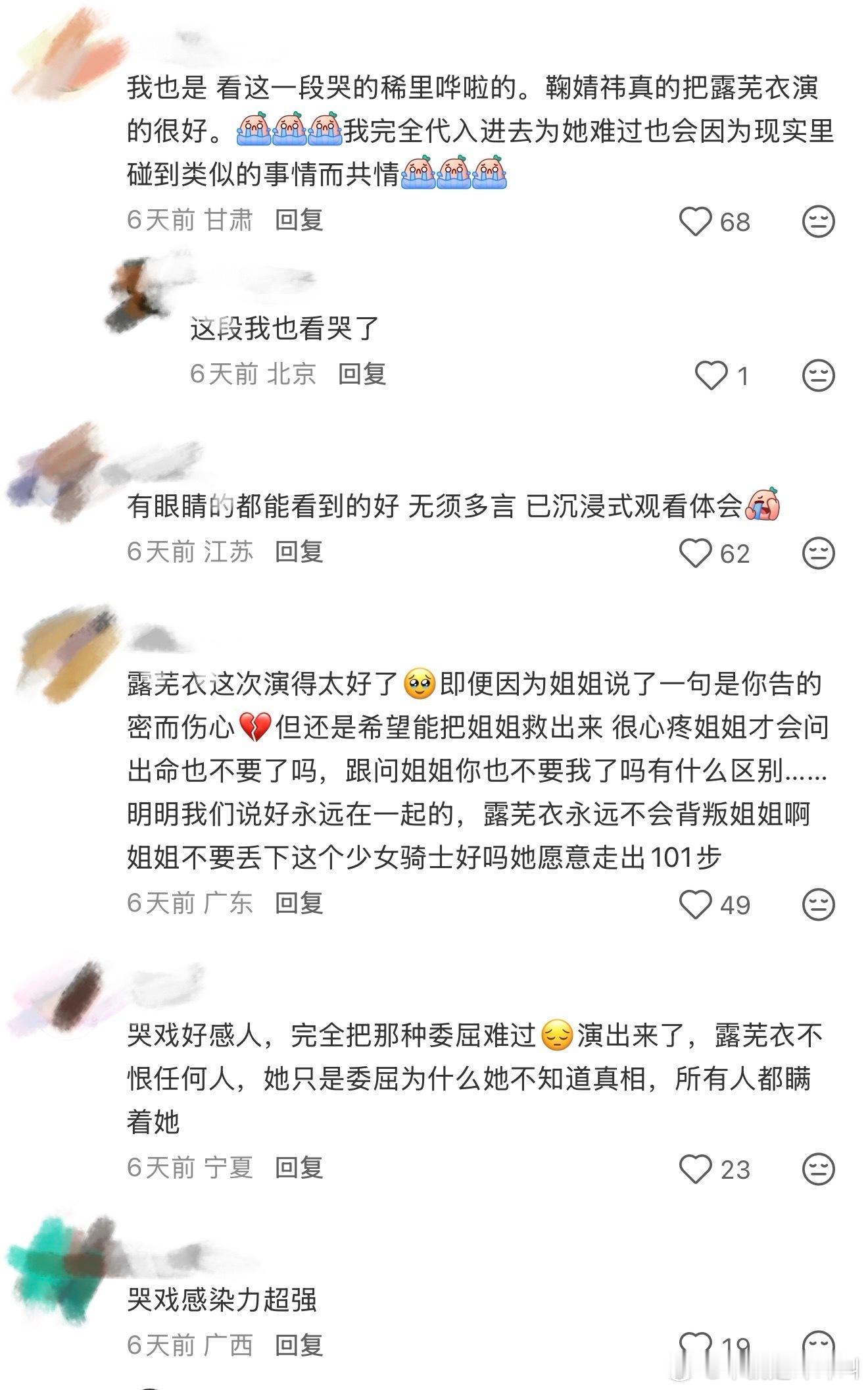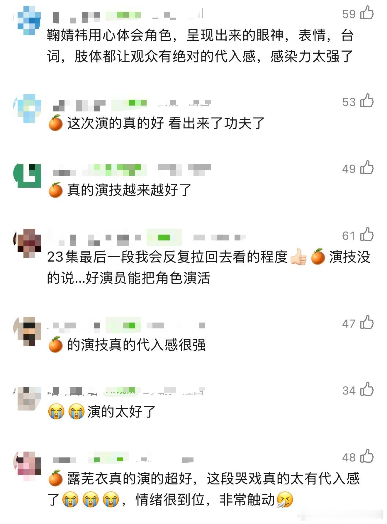 鞠婧祎回溯这段的演技被全平台认可了,都说演出了哀莫大于心死,回想一下觉得鞠姐好争气。月鳞还没播完演技口碑和路人粉都有了, 有效剧播最好的局面,实在厉害