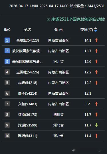 【气温】今天从青藏到华北再到江南多地气温上升,昨天降温最剧烈的内蒙古赤峰一带,今天又上了14时升温榜。奈曼旗升14.1℃排名第一,敖汉旗升13.7℃,排名第二。最近3天,敖汉旗在升降温榜单上来回切换,连续3天都是第二。今天东北、新疆、华南等地,因为冷空气或降水影响,出现降温。