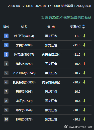 黑龙江牡丹江降11.9℃、内蒙古阿荣旗降11.5℃、吉林白山降9.3℃、新疆尼勒克降10℃、广西北海降9.6℃、广东信宜降8.8℃,为各自省区14时降温最强站点。今天截至14时最高,云南元阳、元江、海南昌江、白沙,4个站点出现35℃以上高温。