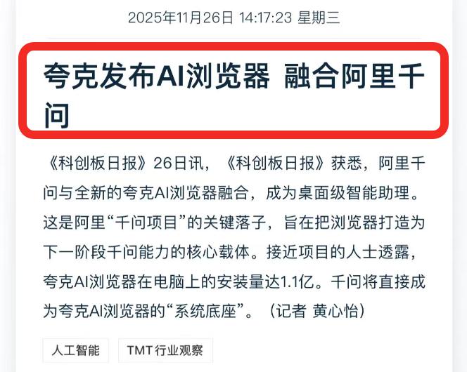 本以为一个月前的消息仅仅是个消息,但没想到的是在阿里千问公测一周,下载量就突破1000万之后,夸克AI浏览器就和阿里千问进行了深度融合,将成为超1亿用户的桌面级智能助理。