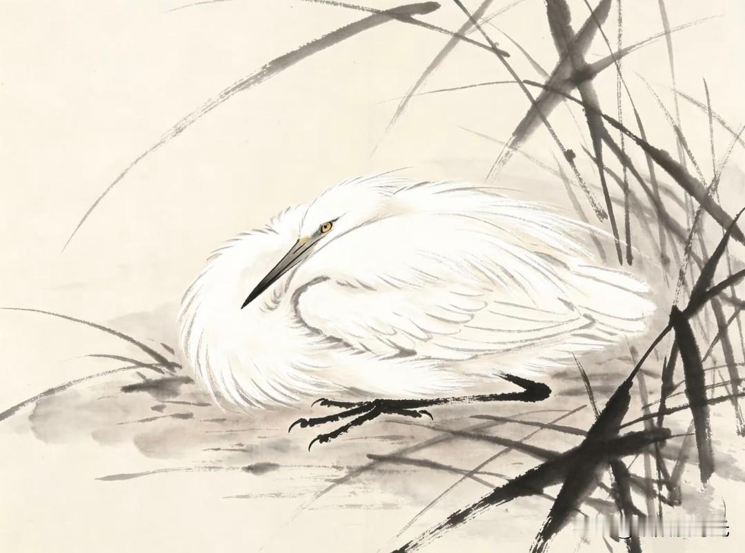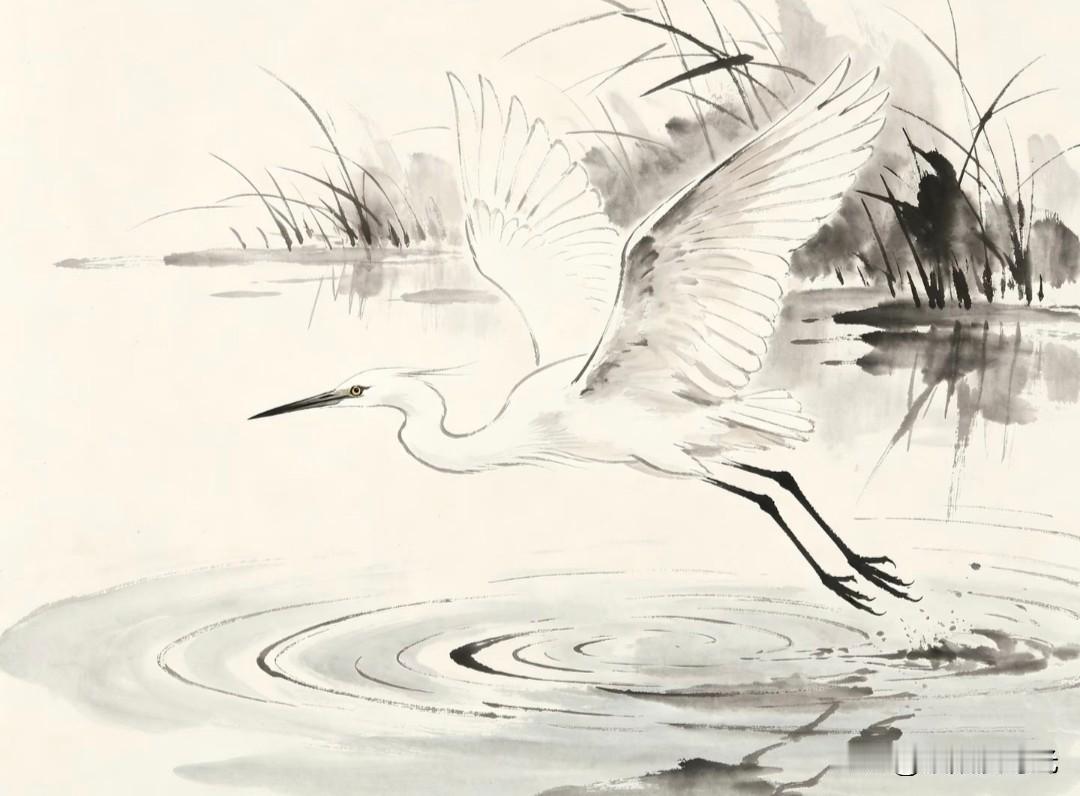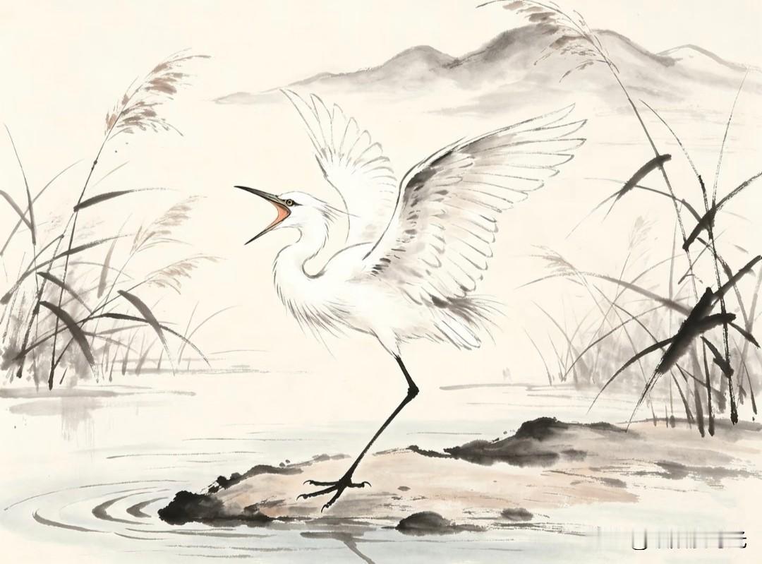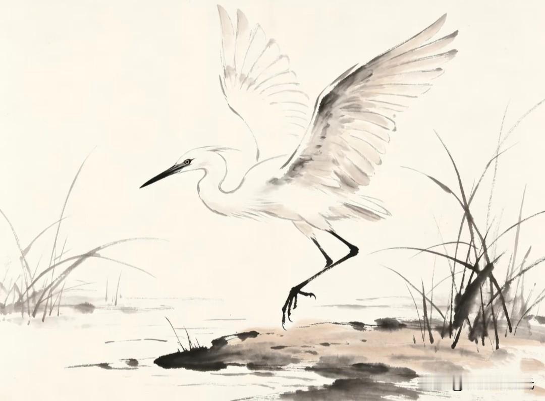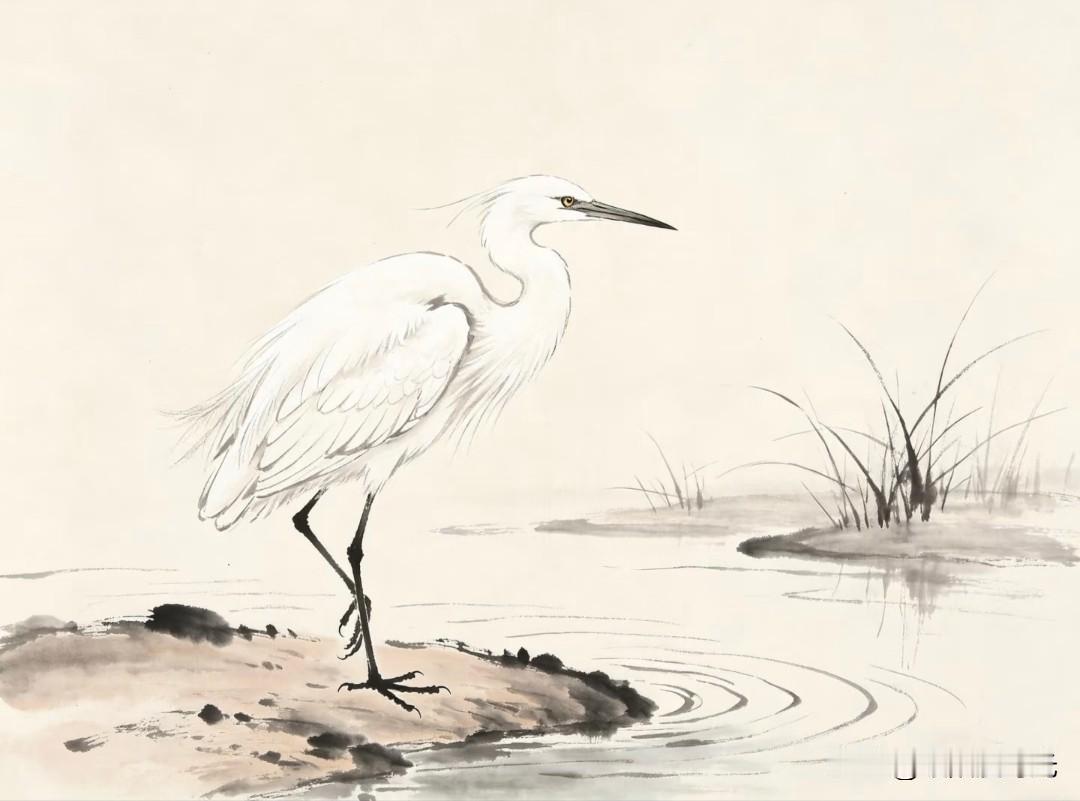 优雅的白鹭捕鱼瞬间,静谧自然之美。 小画拾光水墨写意白鹭插画分享 白鹭小憩 田野