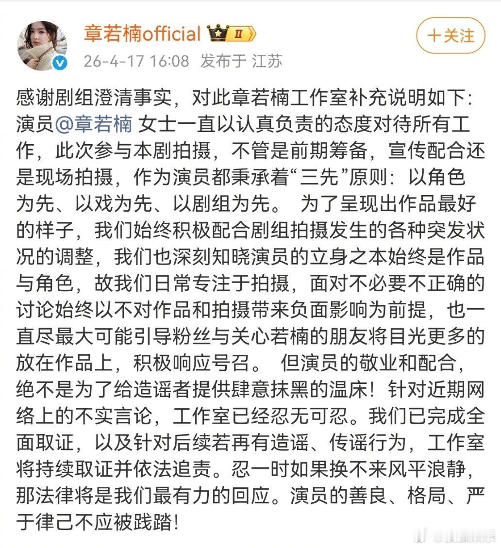 章若楠方将追责造谣者 对于网传章若楠片场拍戏走神等相关舆论,章若楠工作室再发文强调,章若楠一直以认真负责的态度对待所有工作,作为演员都秉承着“三先”原则:以角色为先、以戏为先、以剧组为先。