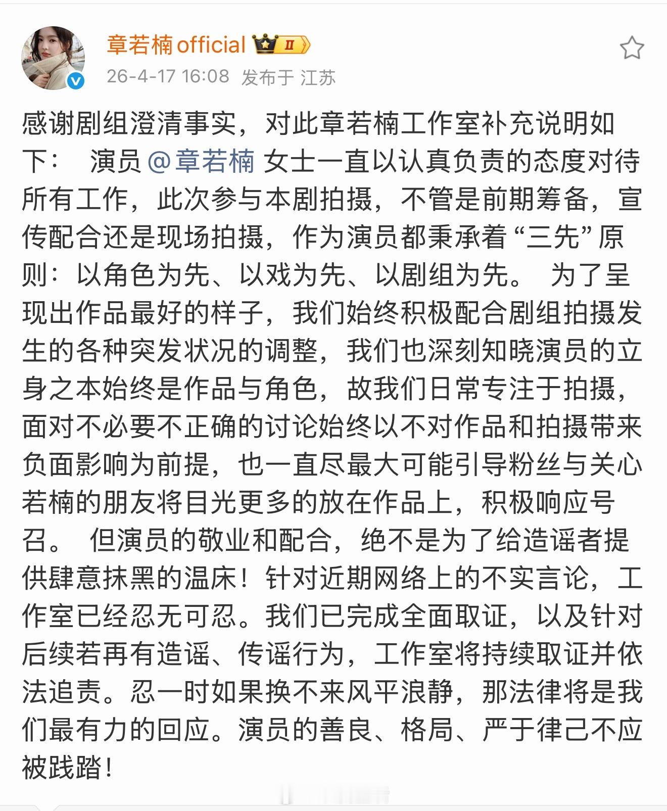 想把你和时间藏起来剧组声明还了章若楠清白,走戏时被围观的人大声呼喊惊到回头,并未耽误拍戏进度,放过被恶意造谣中伤的女演员吧。