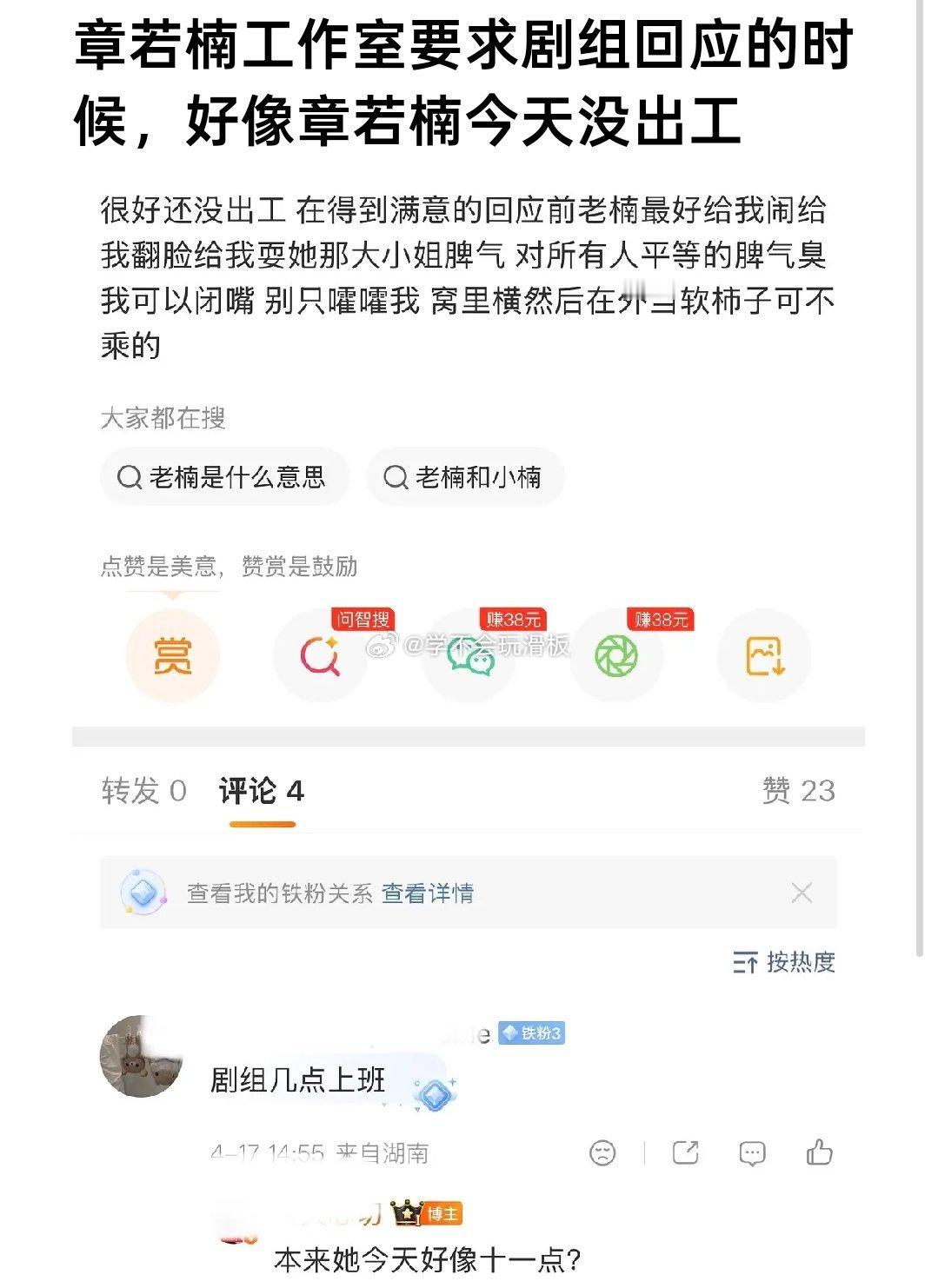而有网友发现,章若楠工作室在问剧组的时候,疑似章若楠罢工,没有出工。