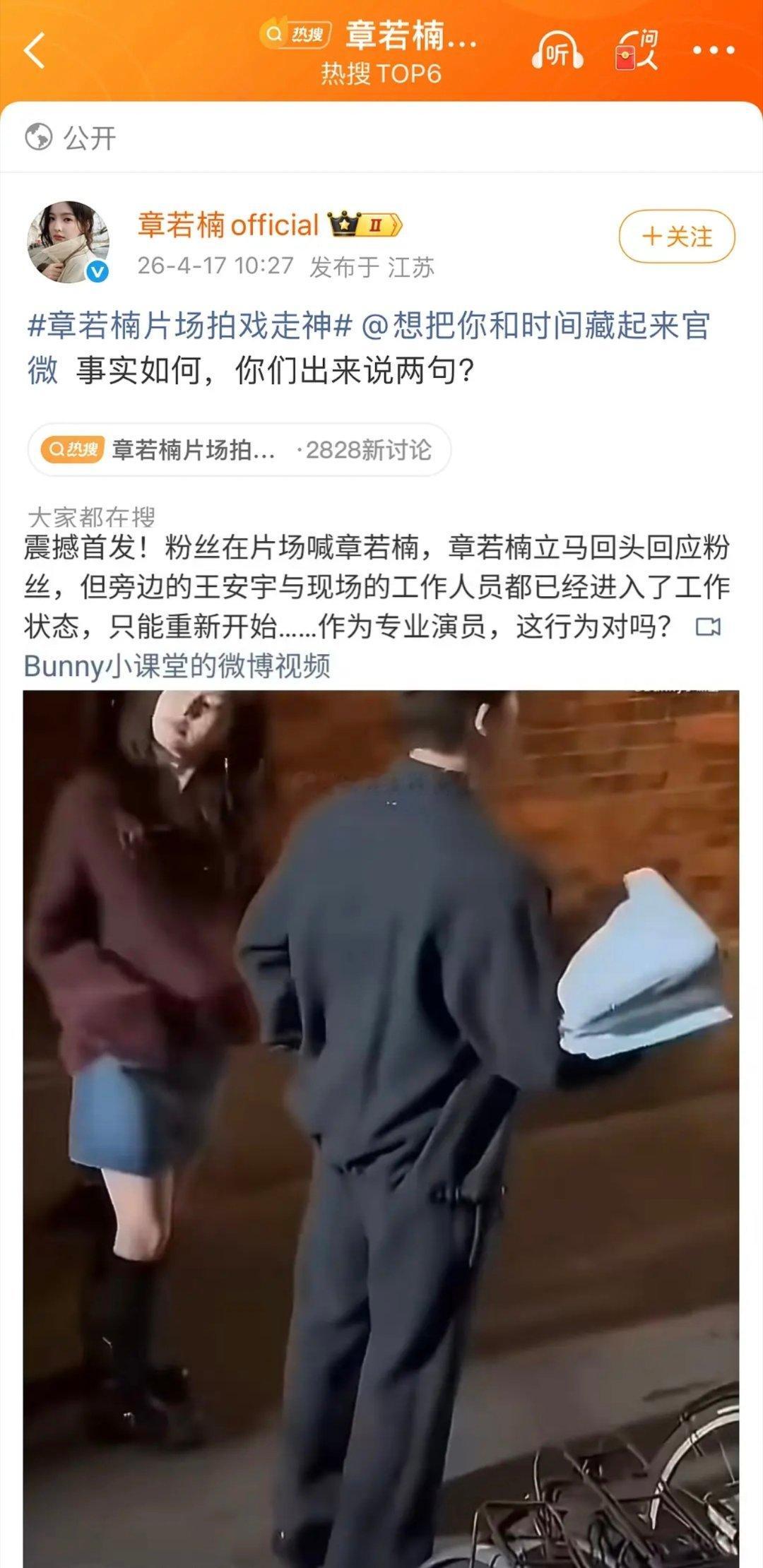 章若楠被曝片场拍戏走神后,章若楠工作室要求剧组《想把你和时间藏起来》官微出来说一句。
