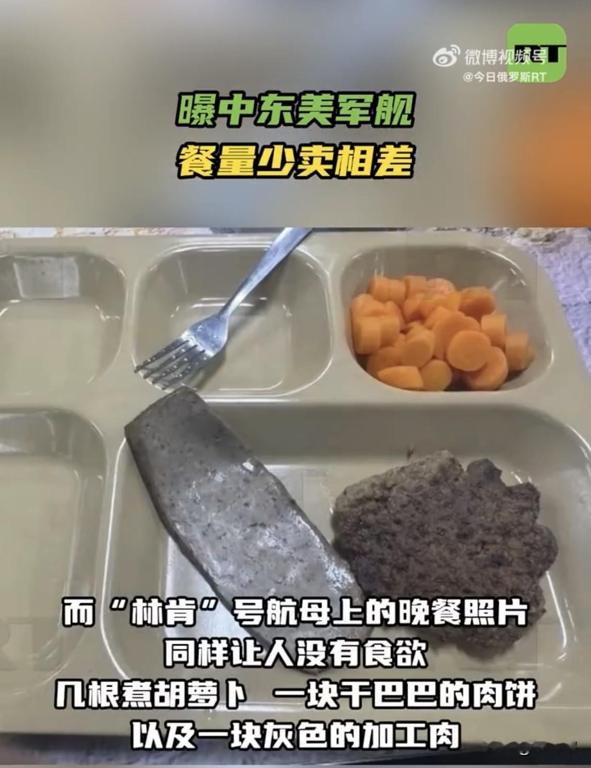 美国媒体《今日美国》曝光了被部署在中东美军舰艇上船员的晚餐,显示“的黎波里”号军舰和‘’林肯‘’号航母的工作餐食物短缺,菜品简单,不是玉米饼就是胡萝卜,还有干巴巴的肉饼,让人无法提起食欲。