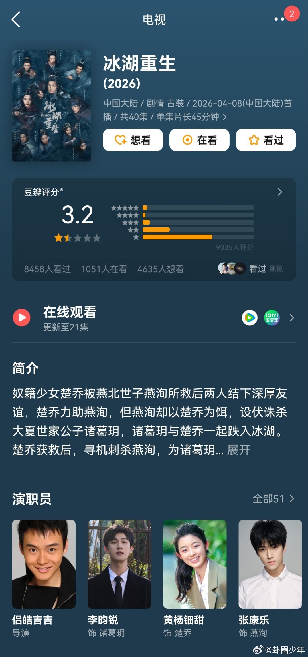 冰湖重生没楚乔传分高楚乔传5.4冰湖重生3.2同样是冰湖名梗改编,两部剧豆瓣分数差距明显,剧情节奏、演员演绎和观众接受度各有不同,口碑差异也反映出不同的市场反馈。