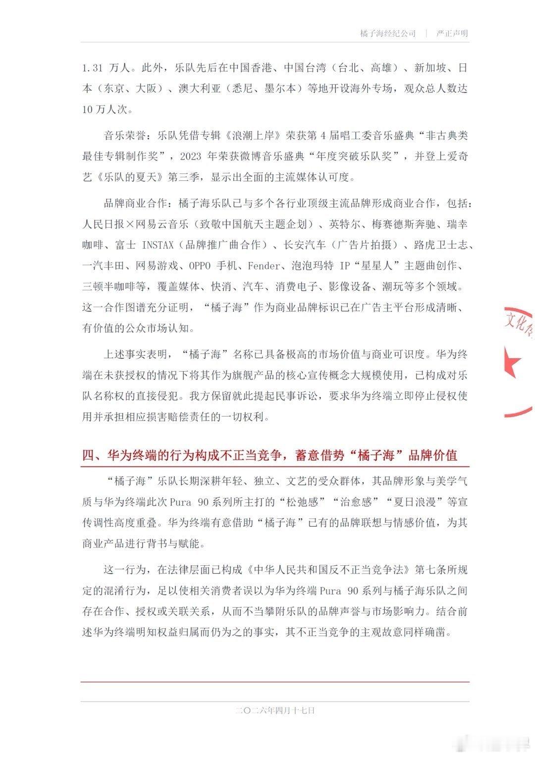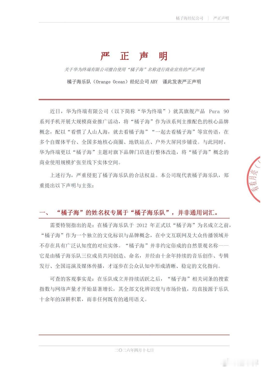 橘子海乐队发布公告称华为侵权!